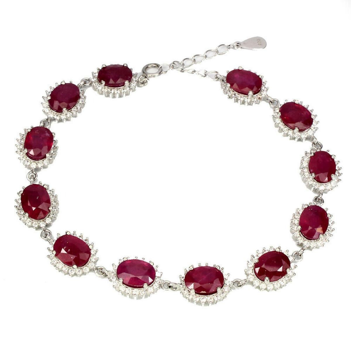925 STERLING SILVER;PLATE-14K WHITE GOLD;LENGTH -(INCHES)8.5;MAIN STONE-RUBY;OTHER GEMS-CUBIC ZIRCONIA;TOTAL WEIGHT-84.68 CT (TOTAL WEIGHT OF SILVER + STONE)DIMENSION* STONE 8.0 X 6.0 MM. * CZ 1.0 MM. * FACE BRACELET 180.0 X 9.0 MM.MAIN STONE SHAPE-OVAL CUT;MAIN STONE COLOR-TOP BLOOD RED;TREATMENT- yes;ORIGIN-MADAGASCAR;HARDNESS-9;
