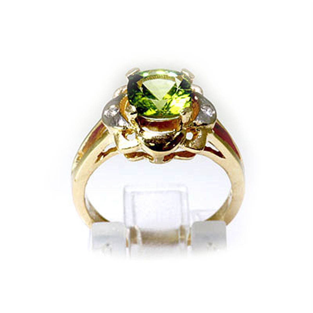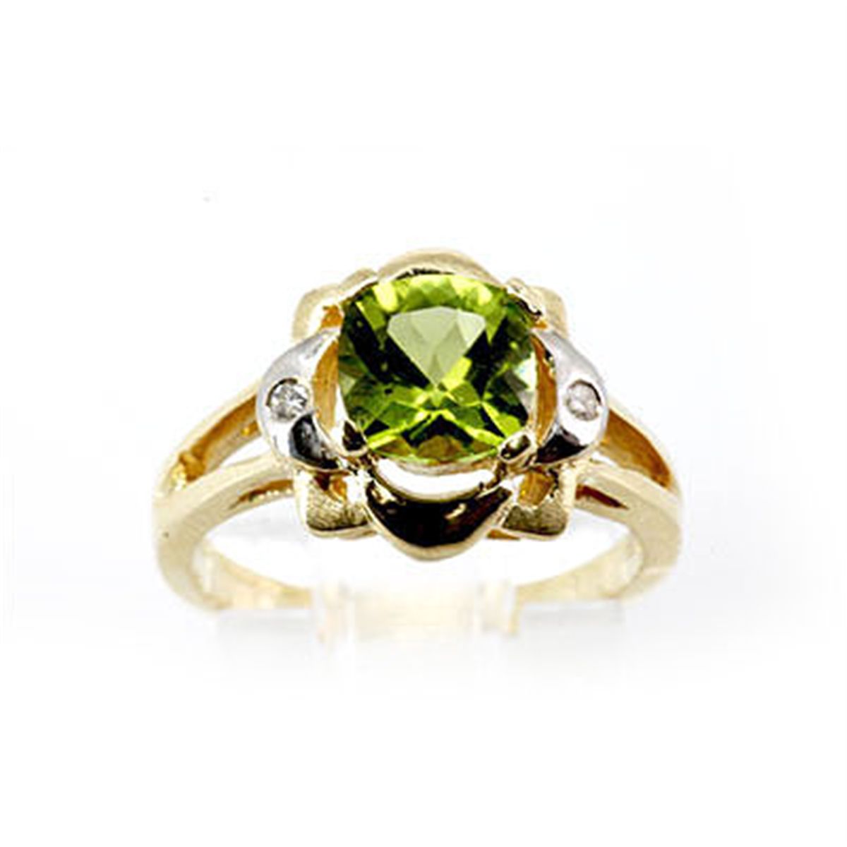 Gemstone: Peridot; Total CTW: 1.54 ctw ; Metal Purity: 14KT ; Total Weight(g): 4.03 ; Ring Size: 5.25; Diamond Count1:2 RoundCut ; Diamond CTW1: 0.02 ; Clarity: SI1-SI2 ; Color:G-H ; Gem Count1: 1 RoundCut ; Gem Carat Weight: 1.52; Main Stone Color:; Availability: 3-10 Business days, ready to ship, with certification of appraisal will take 2 weeks. ; MSRP: $800