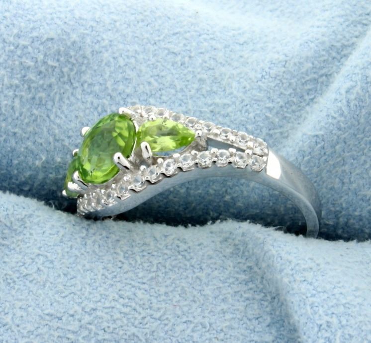 Genuine 6.5mm round Peridot gemstone ring accented with two pear shaped 3mm Peridot gems. The Peridot is surrounded by White Sapphire gemstones, mounted in sterling silver. Size 7. 3.4g