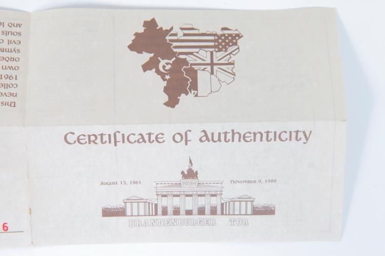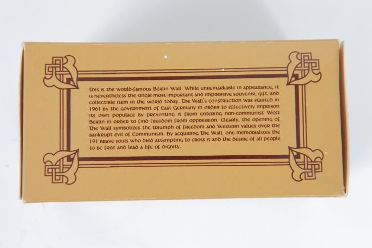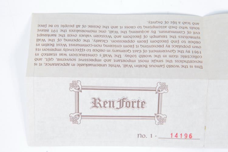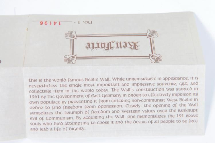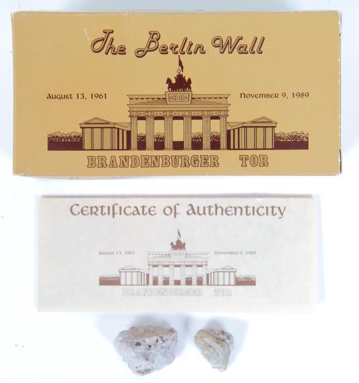 .Genuine Pieces of Berlin Wall Box Gift Set Ren Forte COATwo pieces of the Berlin Wall in a gift box set. Please see pictures for more details. The item includes an official Ren Forte Certificate of Authenticity, gift box, and branded pouch.