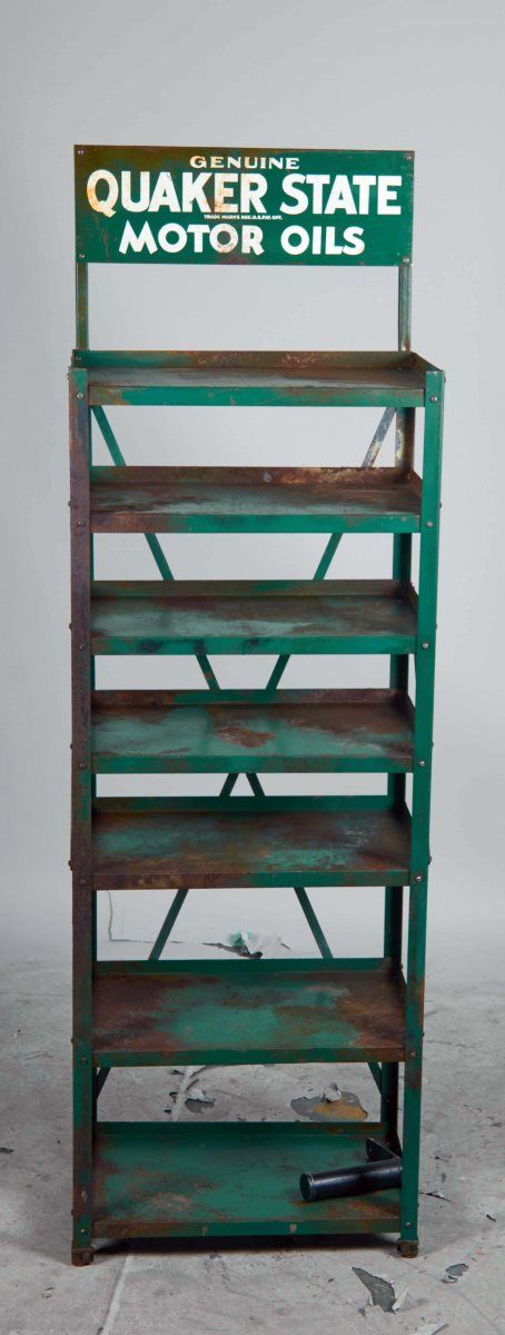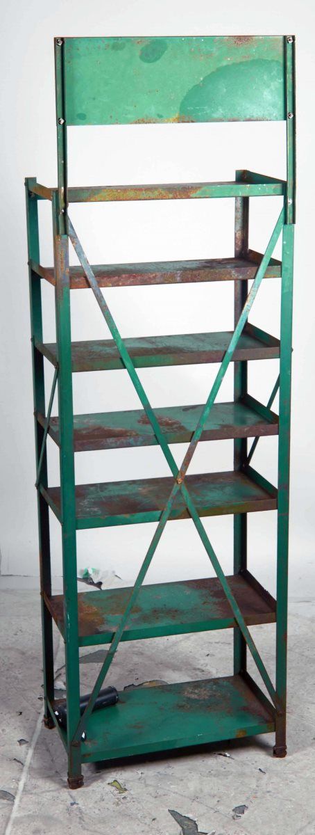 Green metal store floor rack w/ 7 shelves & top sign, Some rusting throughout Condition Fair Size 21" x 13" x 65-1/2"h