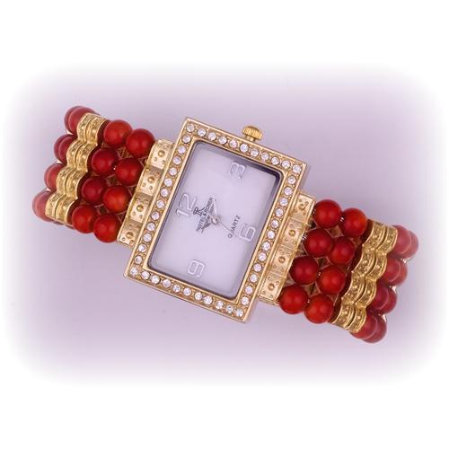This exquisite watch is fashioned from genuine Red Jade beads and it is set with simulated Diamonds for lots of sparkle. The square bezel and Red Jade bead band create a feminine, stylish watch. Comfortable, adjustable bangle band fits all wrists. Includes 1 year Manuf. Warranty. <BR><BR>Band Width: 3/4 Inches<BR><BR>Face Width: 1.15 Inch<BR><BR>Finish: 14K Gold Plating<BR><BR>Semiprecious Beads: Green Red Jade<BR><BR>Approx. Weight: 2.2 oz. (65 grams)<BR><BR>Watch is water resistant and timing element is quartz crystal.