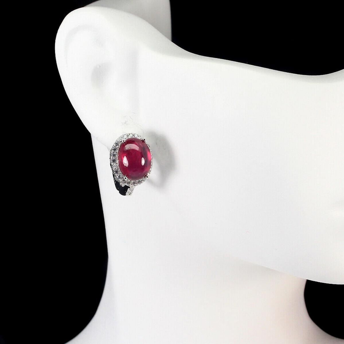 925 STERLING SILVER;PLATE...14K WHITE GOLD;MAIN STONE-RUBY;OTHER GEMS-CUBIC ZIRCONIA;TOTAL WEIGHT-26.89 CT (TOTAL WEIGHT OF SILVER + STONE)DIMENSION* STONE 10.0 X 8.0 MM. * CZ 1.0 MM. * FACE EARRINGS 15.0 X 10.0 MM.;MAIN STONE SHAPE-OVAL CABOCHON;MAIN STONE COLOR-TOP RICH RED;CLARITY/GRADE-TRANSLUCENT;LUSTER-CHARMING;TREATMENT-HEATED;ORIGIN-MADAGASCAR;