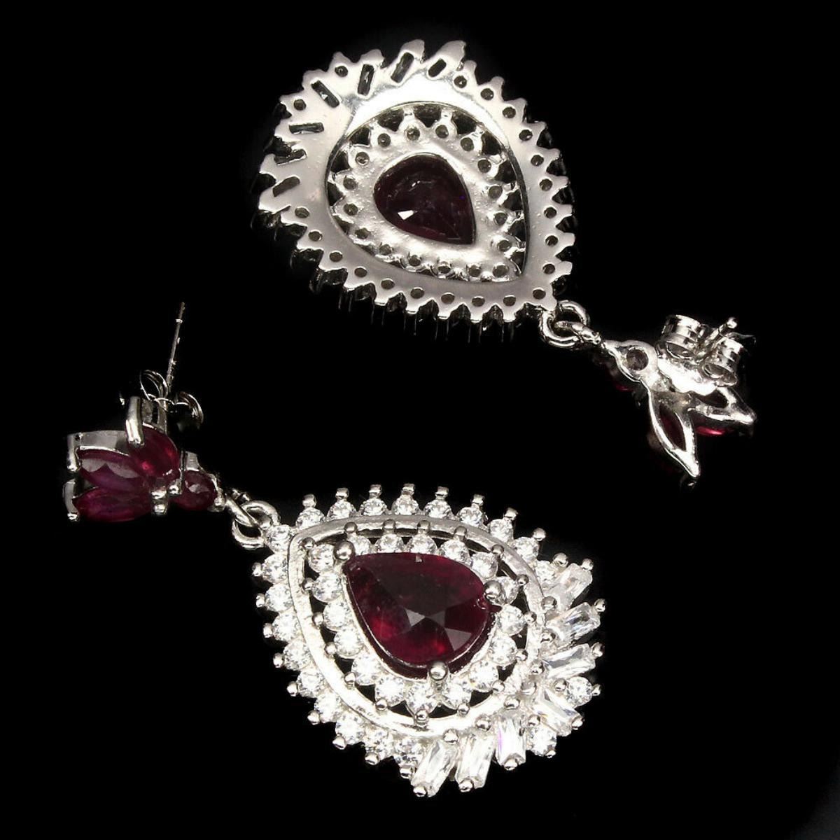 925 STERLING SILVER;PLATE...14K WHITE GOLD;MAIN STONE...RUBY;OTHER GEMS...CUBIC ZIRCONIA;TOTAL WEIGHT...51.68 CT (TOTAL WEIGHT OF SILVER + STONE)DIMENSION* STONE 3.0 TO 9.0 X 7.0 MM. * CZ 1.5 TO 3.0 X 2.0 MM. * FACE EARRINGS 36.0 X 18.0 MM.;MAIN STONE SHAPE..PEAR CUT;MAIN STONE COLOR..TOP BLOOD RED;CLARITY/GRADE..TRANSPARENT;LUSTER..SUBLIME;TREATMENT- yes;ORIGIN...MADAGASCAR;HARDNESS...9;