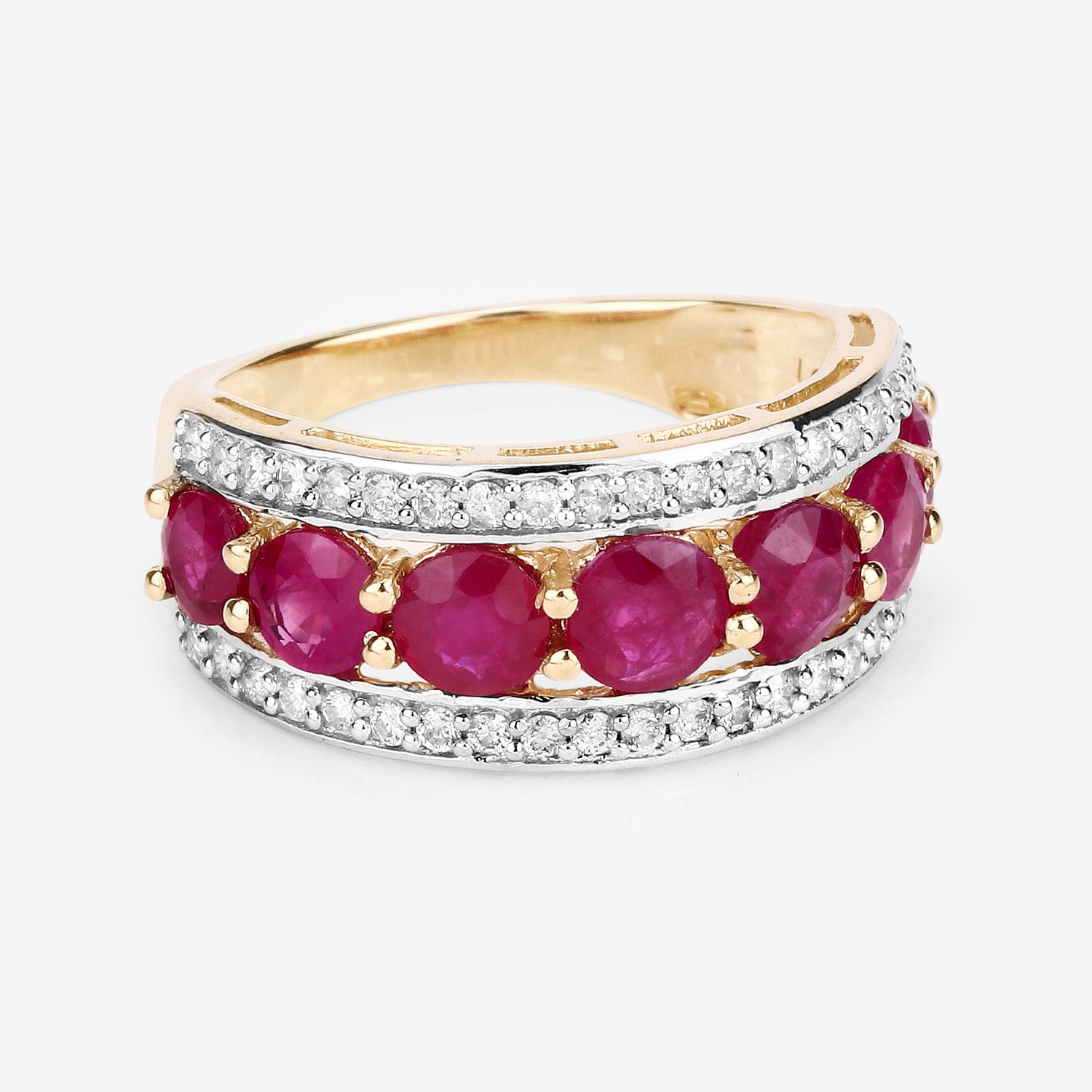 This 14 karat yellow gold ring can symbolize all of the above with 2.82 carats of round, faceted, genuine rubies prong-set in a tapered row with a border of round, brilliant-cut, H-I color, I1 clarity diamonds on each side, totaling .42 carats total weight. The ring is approximately 9.5mm wide at the top and tapers to a 2.25mm shank. The ring is US size 7. See sizing details below. Admin: Q5743/19-ong