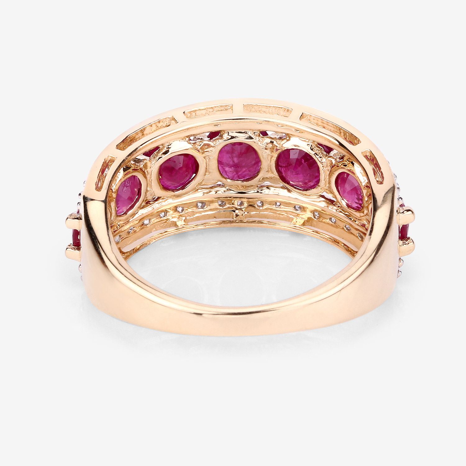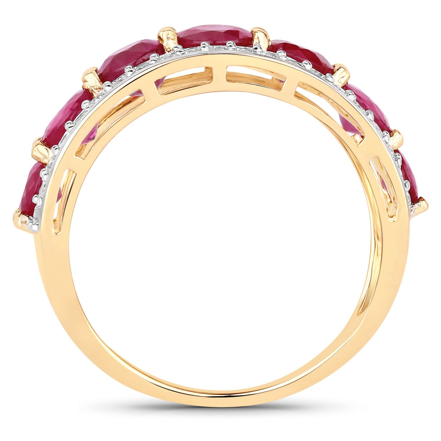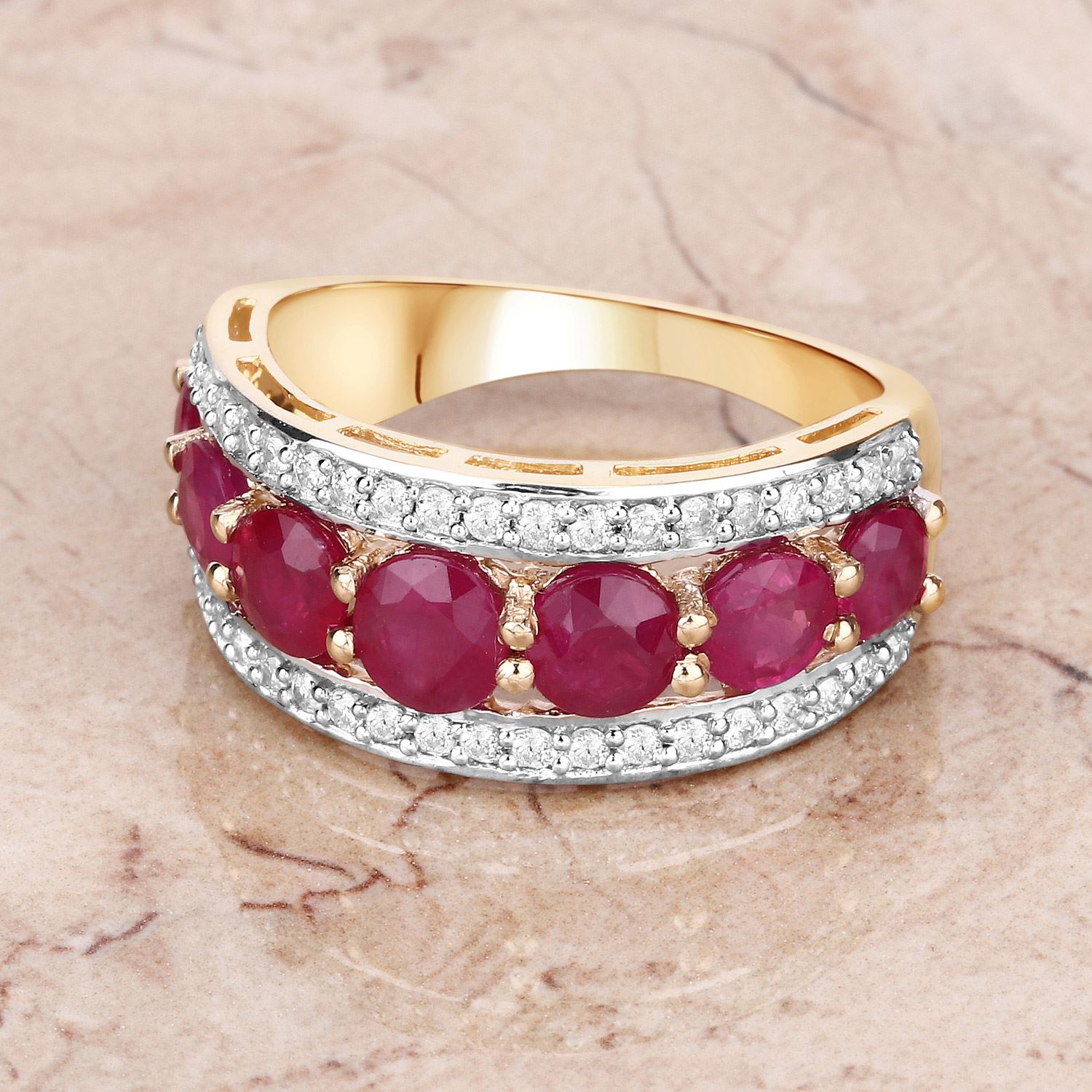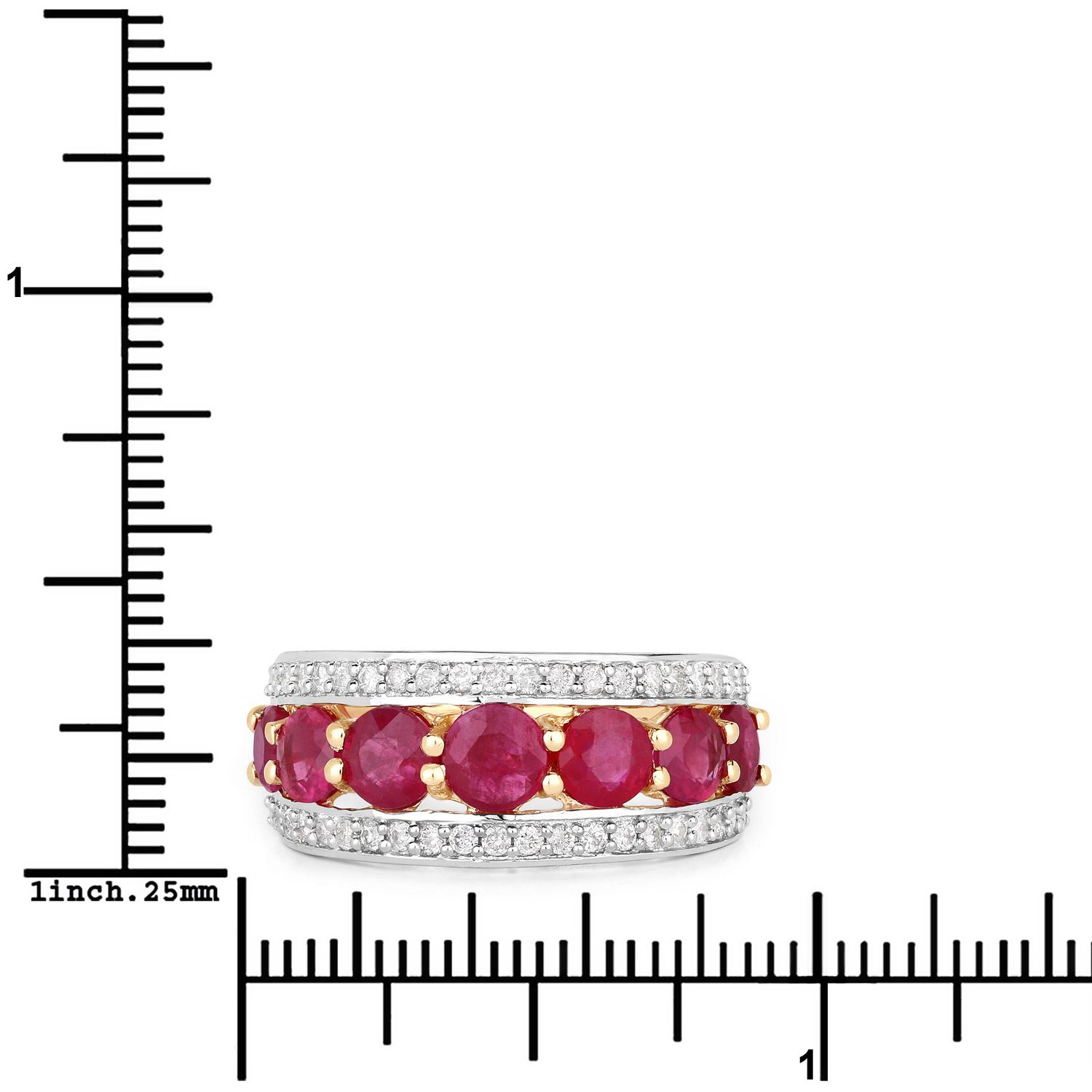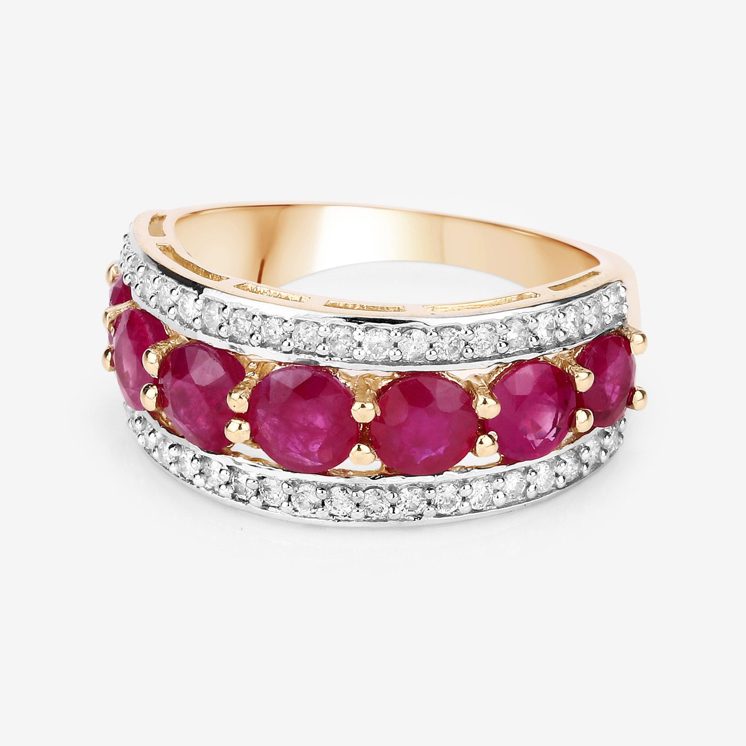 This 14 karat yellow gold ring can symbolize all of the above with 2.82 carats of round, faceted, genuine rubies prong-set in a tapered row with a border of round, brilliant-cut, H-I color, I1 clarity diamonds on each side, totaling .42 carats total weight. The ring is approximately 9.5mm wide at the top and tapers to a 2.25mm shank. The ring is US size 7. See sizing details below. Admin: Q5743/19-ong
