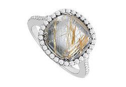 A larger prong-set square genuine rutilated quartz (gold needles) in the center & is surrounded by brilliant-cut round diamonds. Other smaller diamonds adorn both sides. This gorgeous ring is made in 14K white gold & has a total gem weight (TGW) of 2.50 carat.