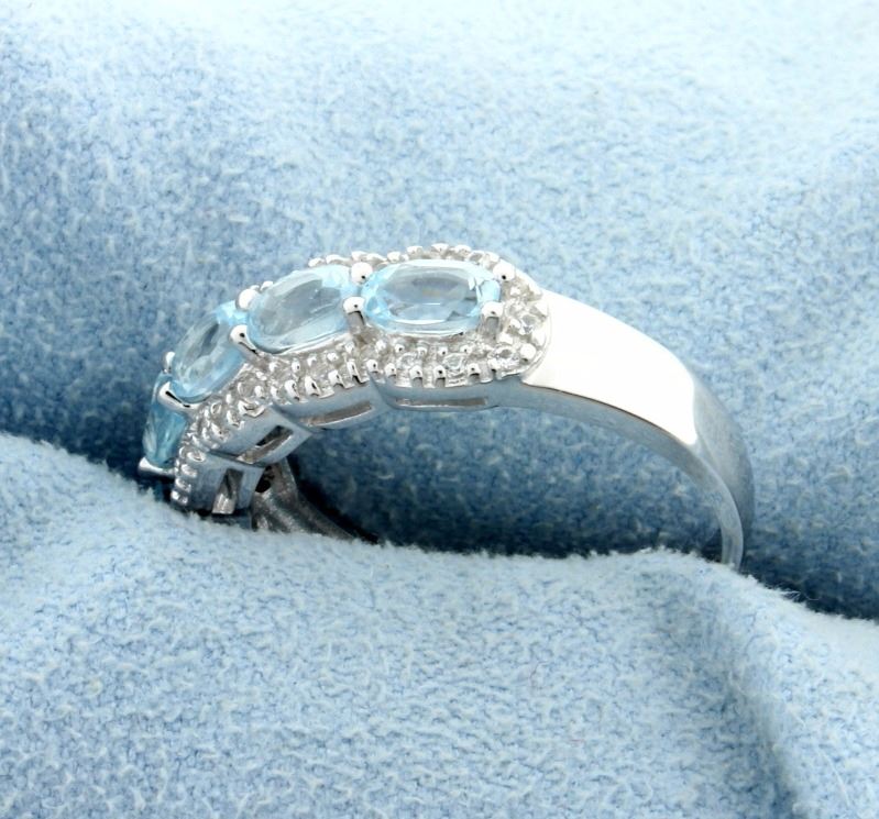 Five 3x4mm oval cut genuine Sky Blue Topaz gemstones, accented with White Sapphire gems, set in sterling silver. Size 8. 3.3g
