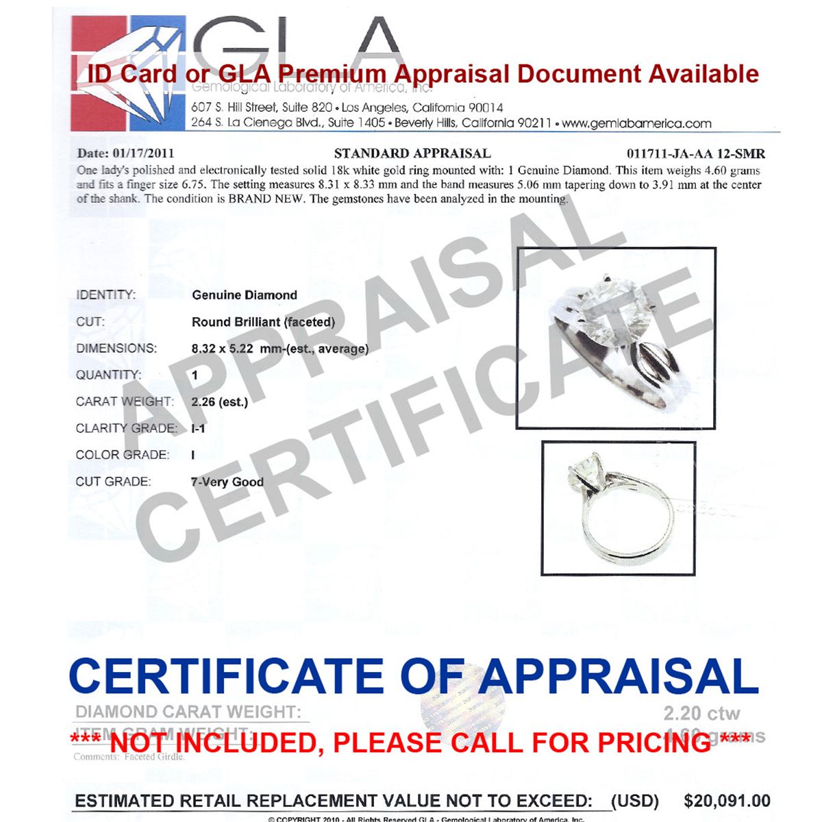 Main Stone: Diamond; Total CTW: 2.26 ctw ; Metal Purity: 14KTGold ; Ring Size: 6.75; Diamond Count 1: 1 RoundCut; Diamond CTW 1: 2.26; Clarity: I-1; Diamond Color: I; Weight: 4.6; Availability: 3-10 Business days, ready to ship, with certification of appraisal will take 2 weeks. ; MSRP: $30100