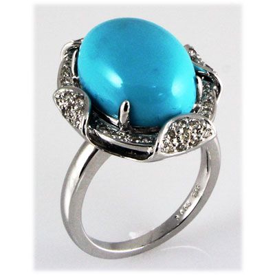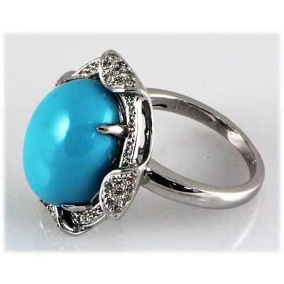 Genuine Turguiose 7.51ctw Diamond Ring 14kt 6.39g **|**|** Mainstone: Turquiose; Total CTW: 7.51 ; Gem CTW: 7.18 ; Dia/CTW: 0.33 ; Diamond Count: 52 ; Diamond Shape: Round ; Grams/Total: 6.39 ; Metal/Purity: 14kt W/G ; MSRP: $1700