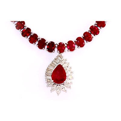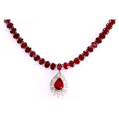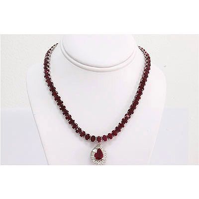 Genuine Vintage Design 91.49 Ctw Ruby Necklace 14k **|**|** Gemstone: Ruby ; Total CTW: 91.49 CTW ; Metal Purity: 14KT ; Metal: White or Yellow Gold ; Diamond Count 1: 12RD/5PEAR/12BG ; Diamond CTW 1: 2.67 ; Clarity: SI1-SI2 ; Color: G-H ; Gems Count1: 68 Ovalcut /1 Pear Cut ; Gems Weight 1 / Carat: 88.82 ; Ge; Availability: 3-10 Business days, ready to ship, with certification of appraisal will take 2 weeks. ; MSRP: $16100