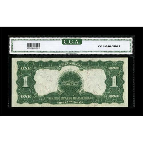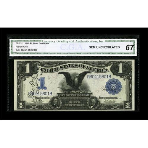 <B>Geo. Fort Courtesy Autograph Fr. 232 $1 1899 Silver Certificate CGA Gem Uncirculated 67.</B></I> This deeply embossed note is the second of two notes in this auction autographed by Geo. Fort Asst. Treas, U.S. of this Friedberg number. The census shows he autographed just four notes, a cut sheet, of this Friedberg number.<BR><BR><b>Shipping:</b> Coins & Currency (<a target="_blank" href="http://www.heritageauctions.com/common/shipping.php">view shipping information</a>)