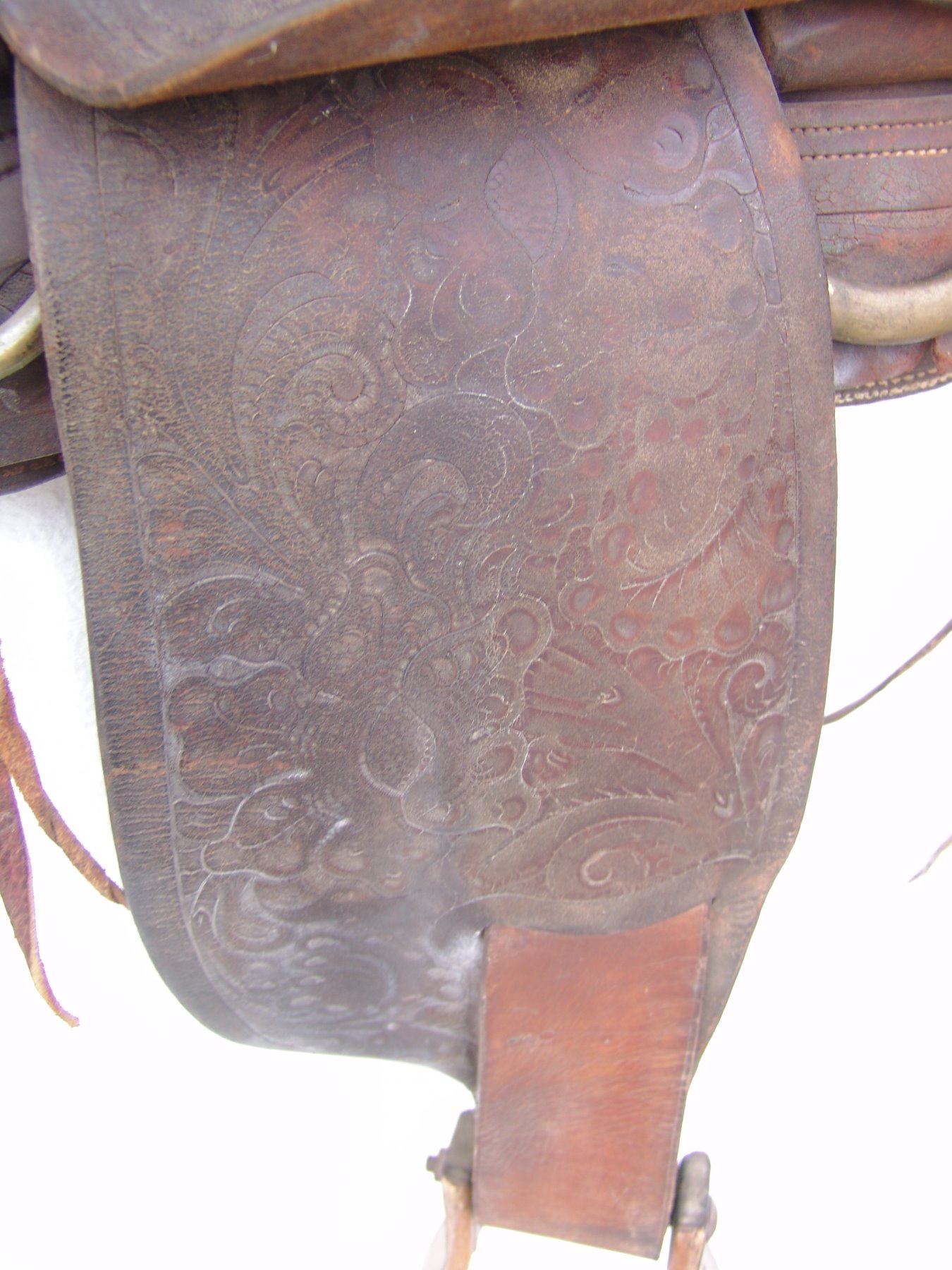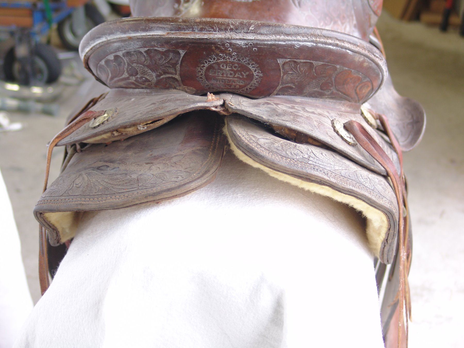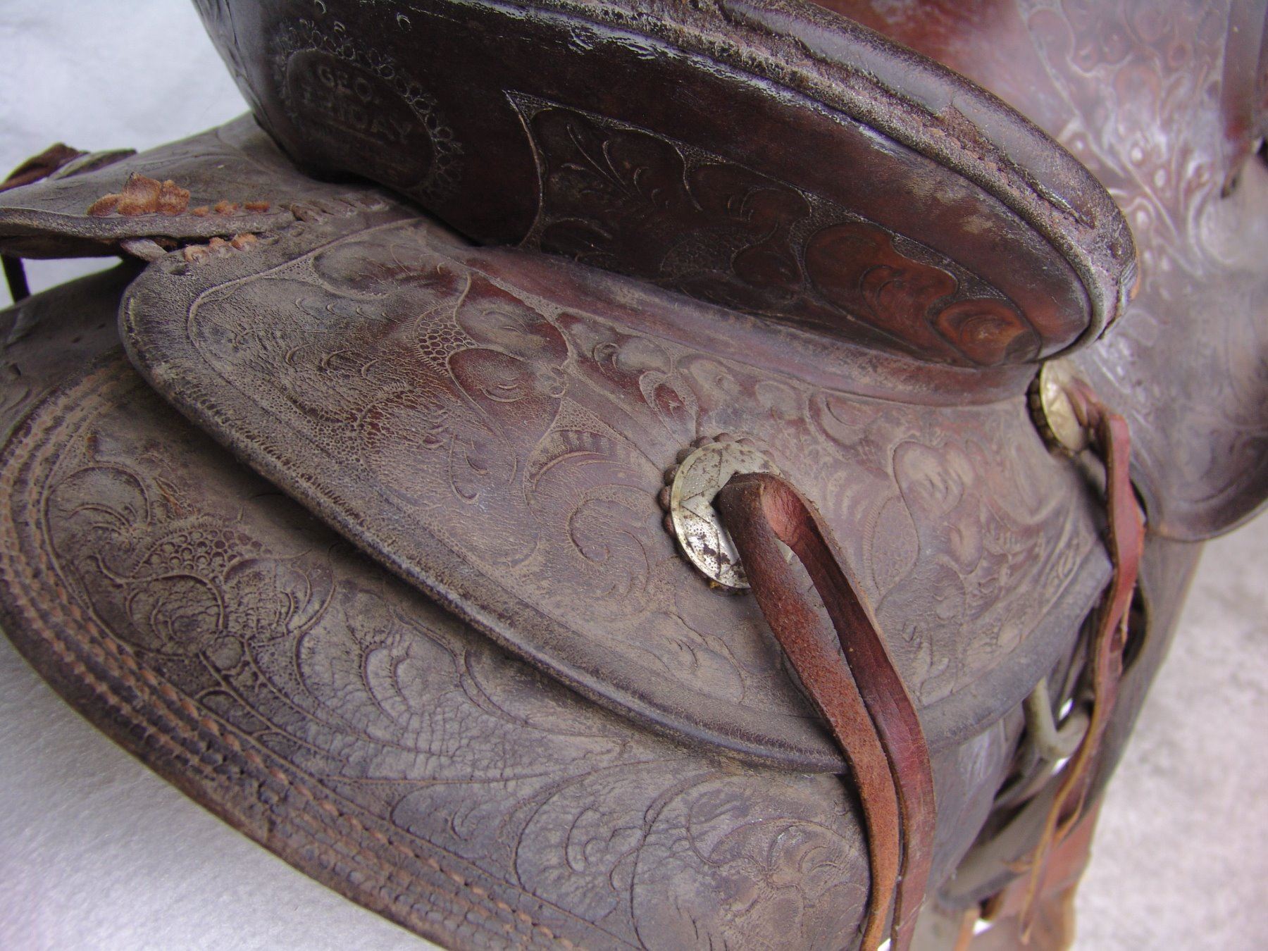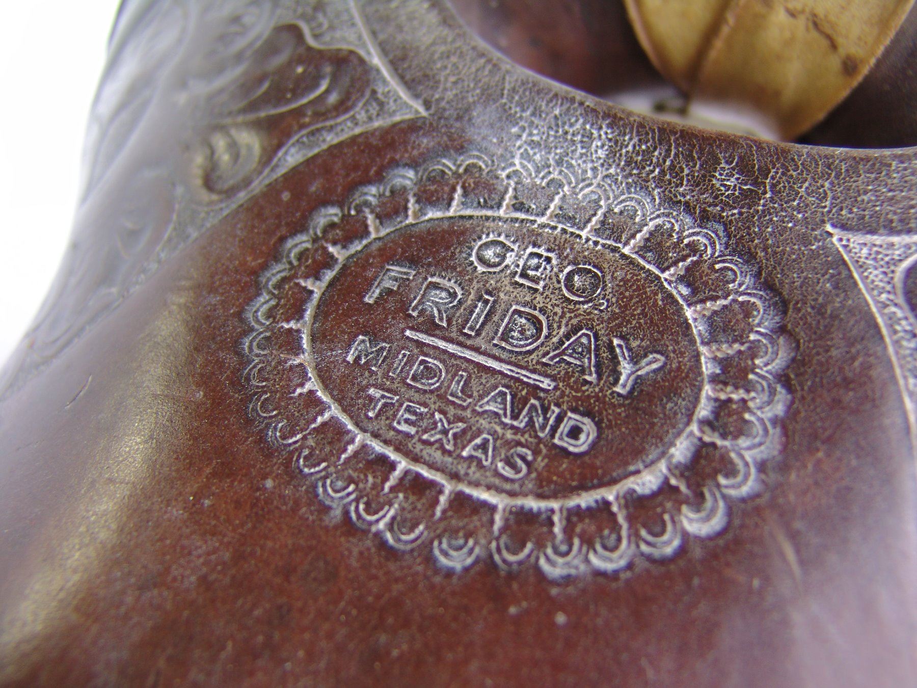 Fancy western pleasure saddle with fully tooled body, rawhide reinforced horn, mid-rise cantle, rounded skirts, & 14 1/2" seat. Marked "Geo. Friday Midland, Texas". Good condition.