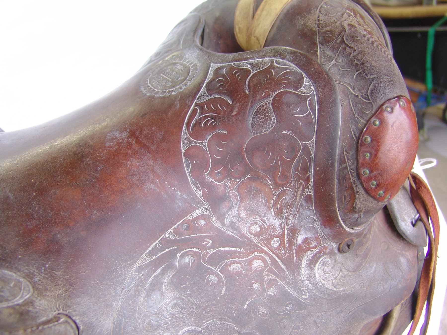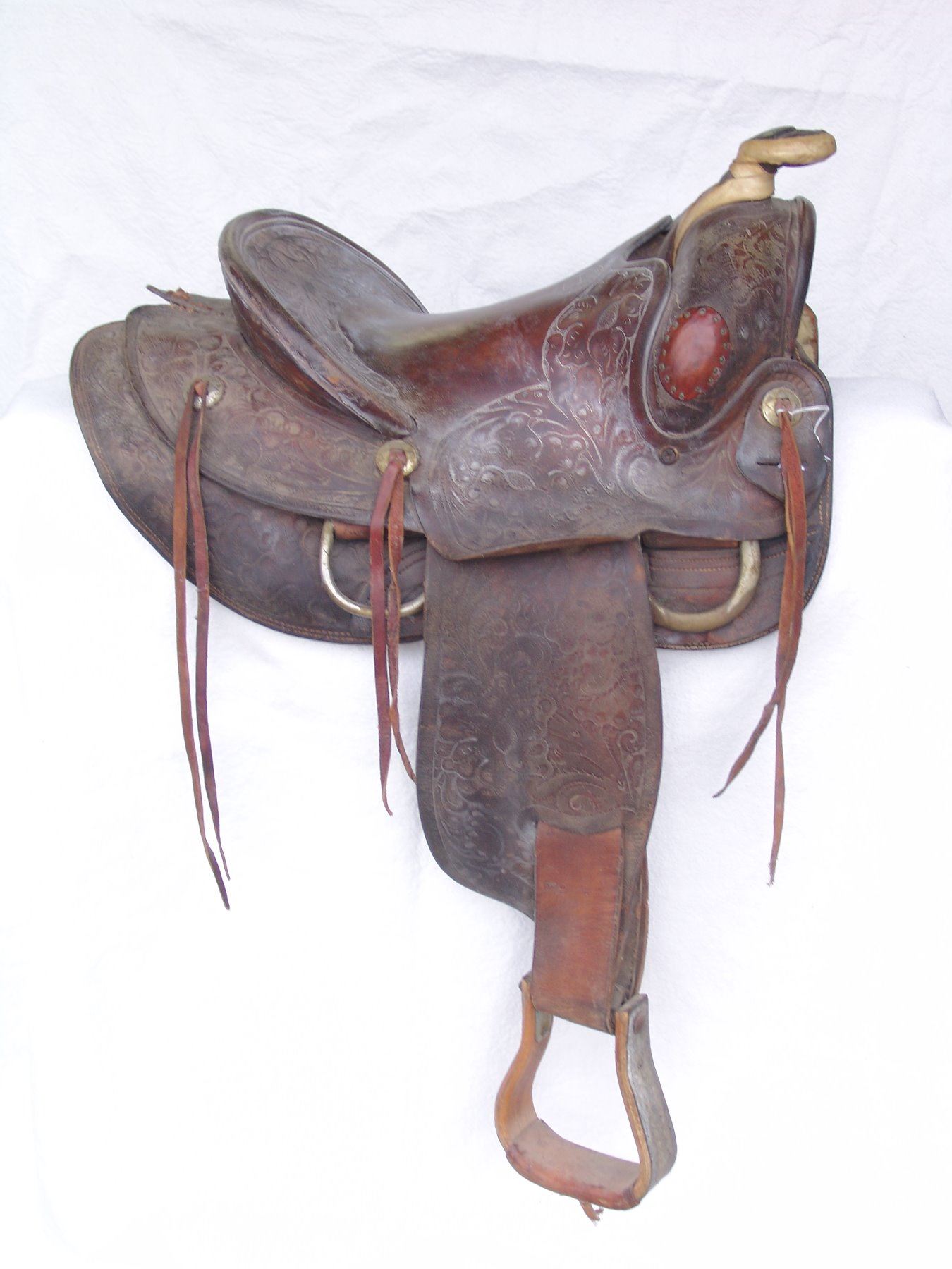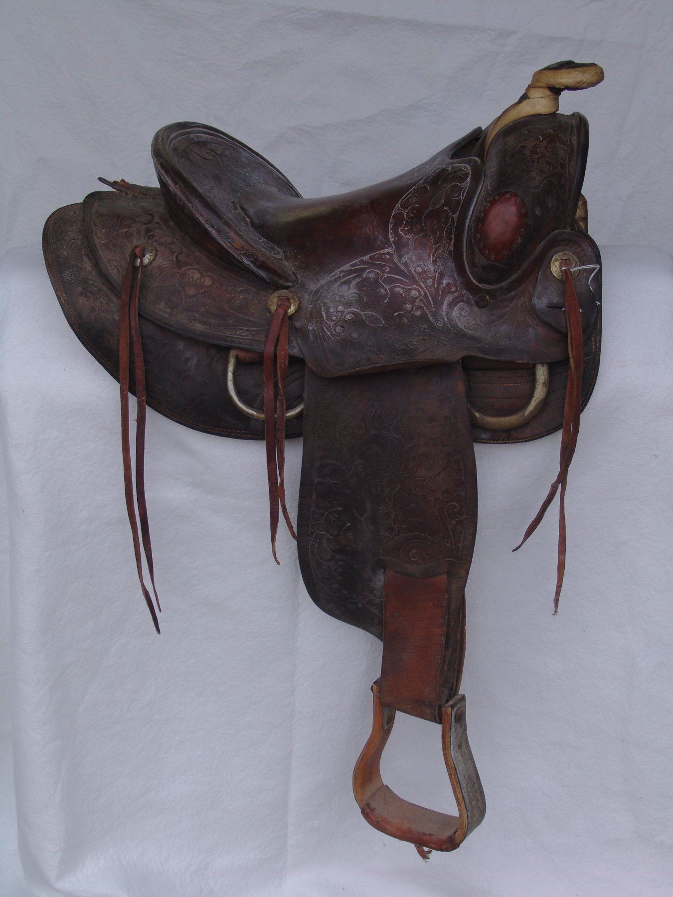 Fancy western pleasure saddle with fully tooled body, rawhide reinforced horn, mid-rise cantle, rounded skirts, & 14 1/2" seat. Marked "Geo. Friday Midland, Texas". Good condition.