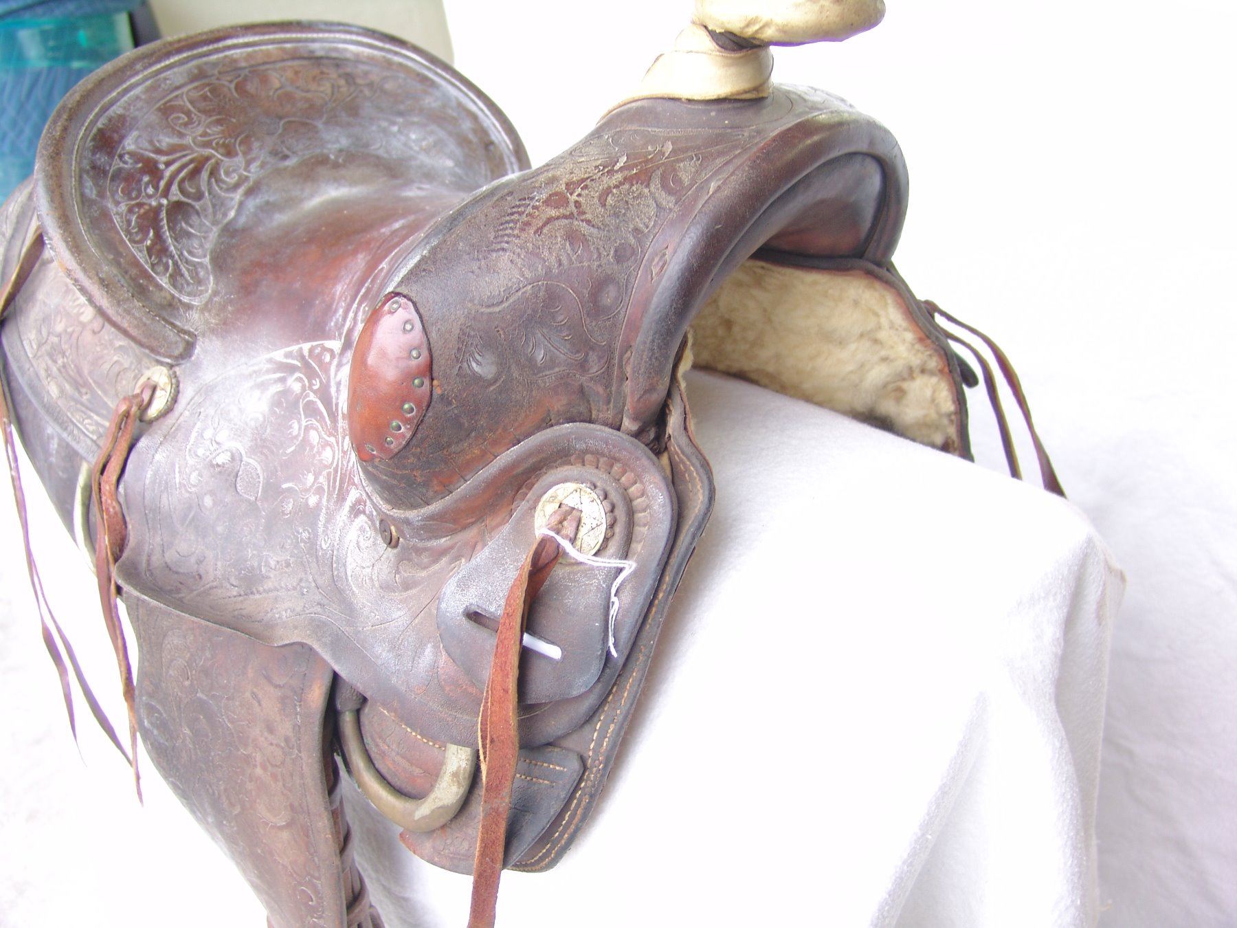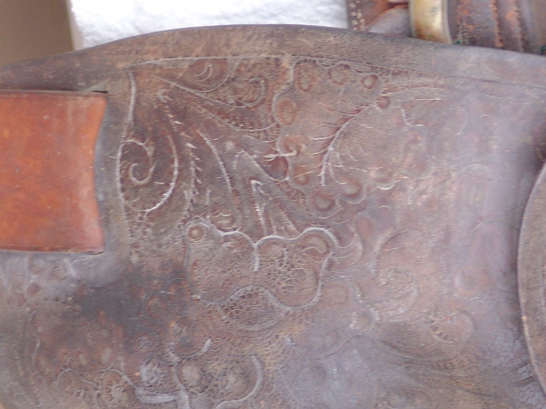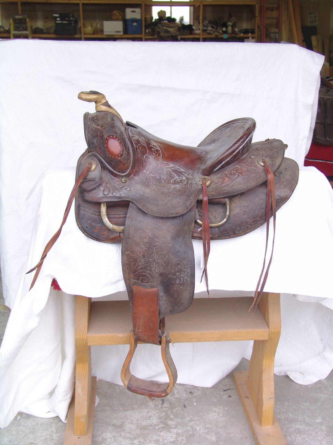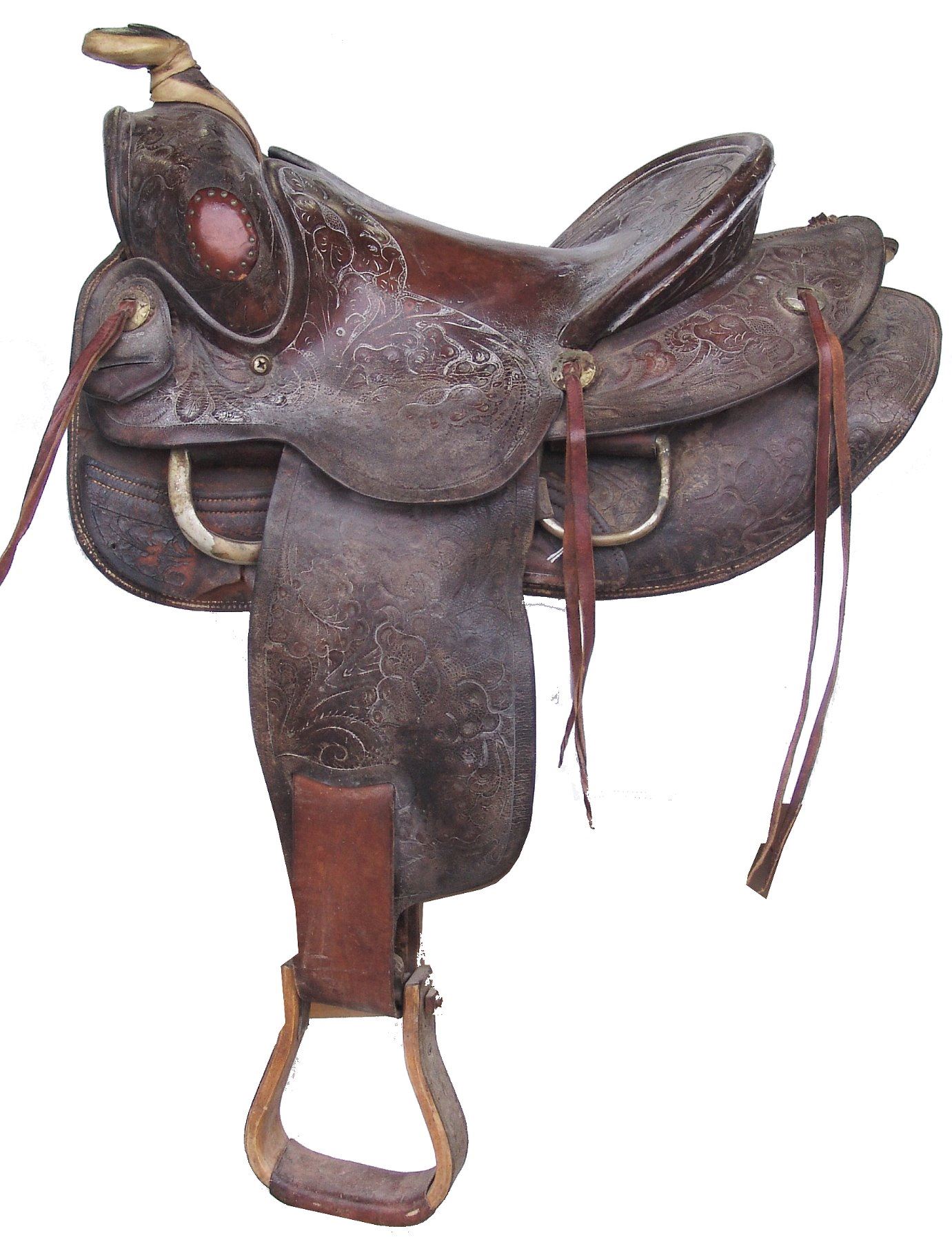 Fancy western pleasure saddle with fully tooled body, rawhide reinforced horn, mid-rise cantle, rounded skirts, & 14 1/2" seat. Marked "Geo. Friday Midland, Texas". Good condition.