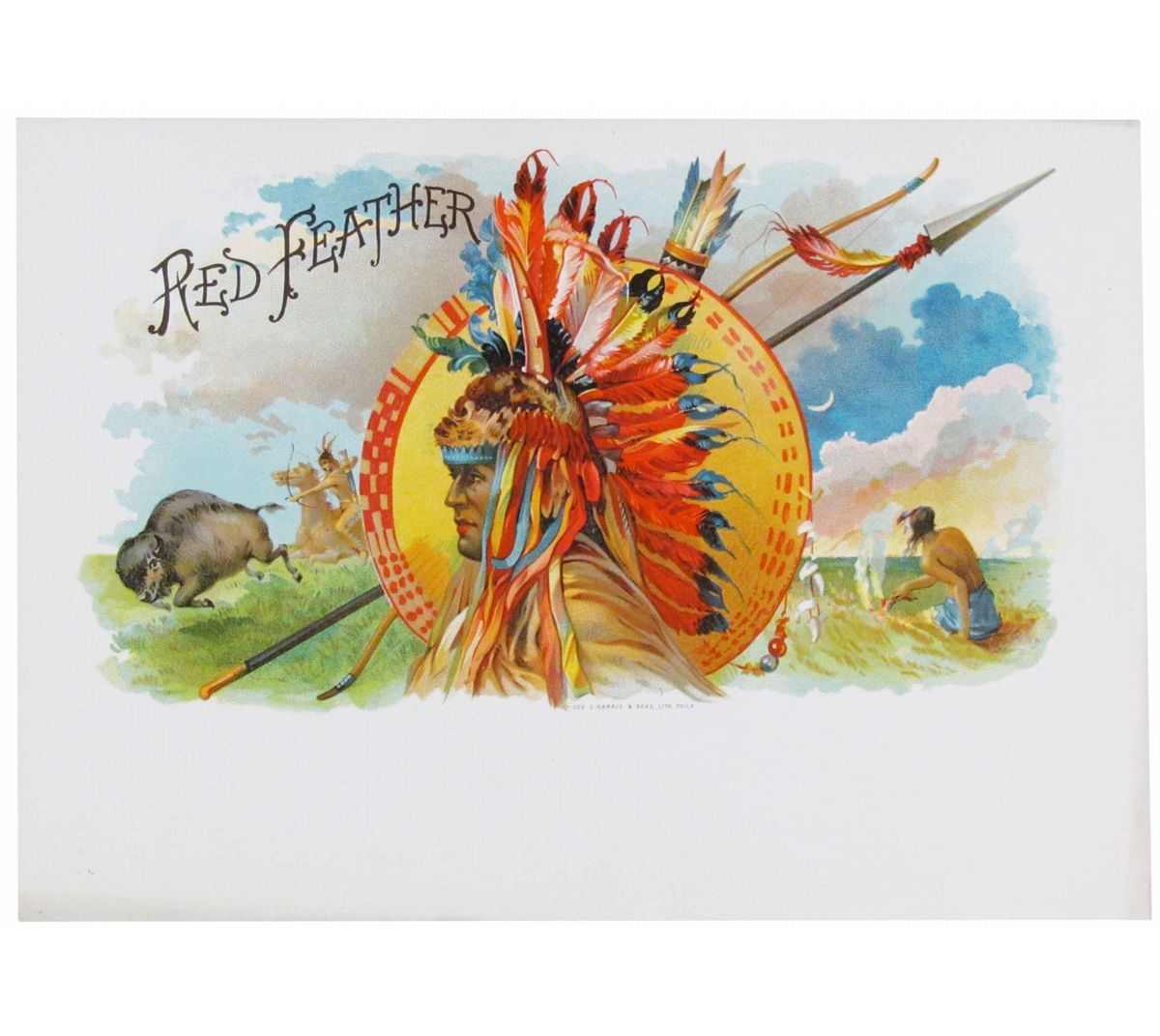 Rare Geo. Harris & Sons, Litho "Red Feather" Scarce Cigar Label. Beautiful colors and Native American graphics, mint condition. 8 3/8 X 6 inches.