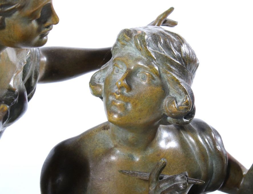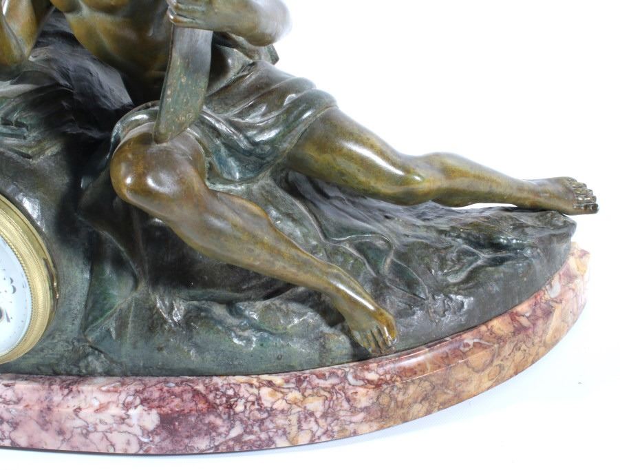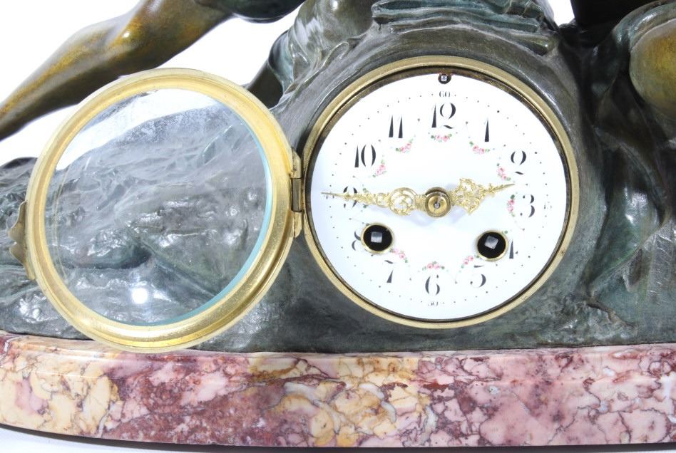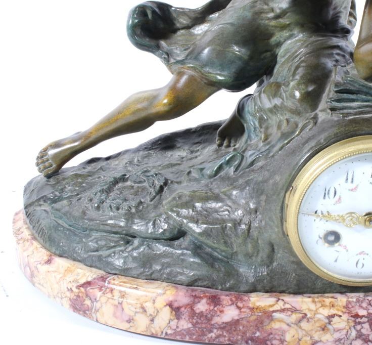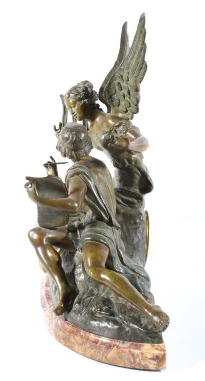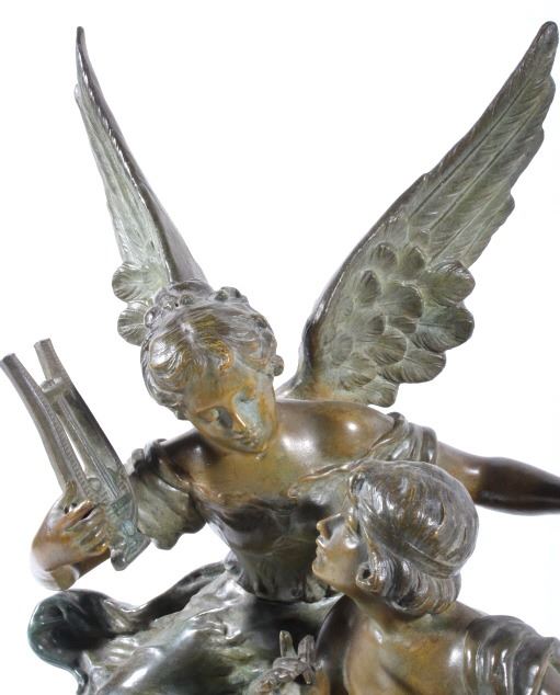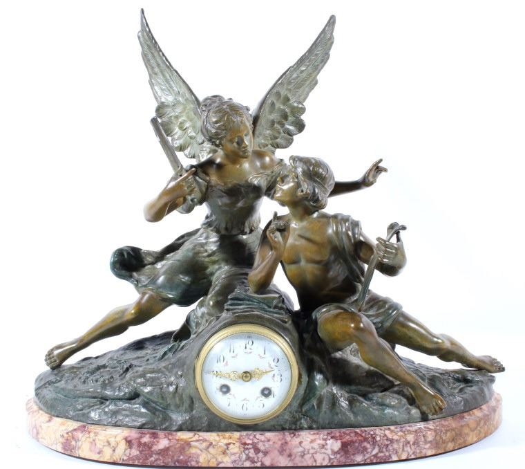 Featured in this lot we have a Bronze and porcelain mantle clock made by Geo Maxim. The Piece was made by French artist Geo Maxim lived from 1888-1954. The piece shows a female angelic figure with a harp above a young man with quill and paper. Underneath the two figures is a beautiful clock with a domed glass front with a shiny brass boarder and hands, and it shows a wonderful porcelain face. The piece is in good condition with a warm patina. The piece measures 20 3/4" wide by 17 3/4" tall by 6 1/2" deep.