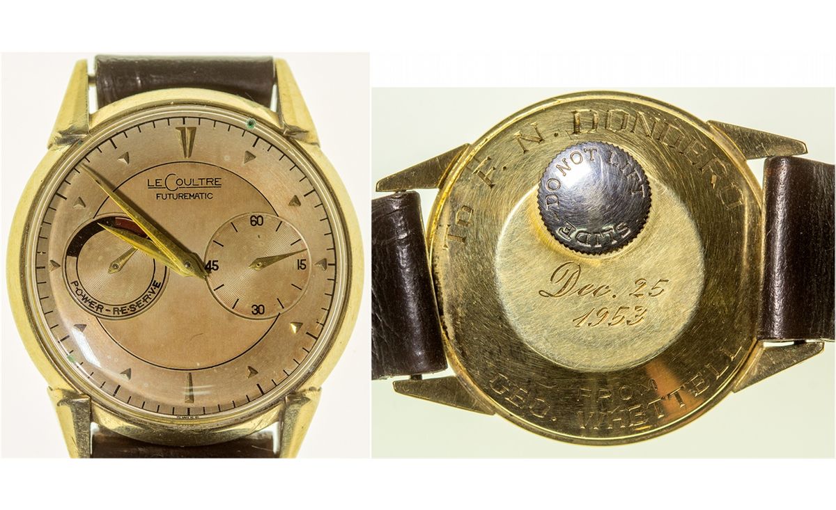 1953 Beautiful LeCoultre "Futurematic" wristwatch, given to F.E. Dondero by George Whittell, December 25, 1953, as insribed on the back. The LeCoutre men's watch is 14k solid gold, 35mm in dia. self-winding 17 jewel unadjusted movement cal 497. The case is a 2-piece snap together type, with light to moderate wear in good condition. The dial is original fresh silvered 2-tone brushed finish, with evenly coated light brown toning. Hands are original.m George Whittell Jr. was born into a wealthy San Francisco family in 1881. He had a zest for life, and had numerous journeys, affairs, and adventures. In the 1922, he acquired the substantial family fortune, roughly $40 million. In the 1930's, he purchased some 40,000 acres on the Nevada side of Lake Tahoe, including 20 miles of shoreline. In 1939 he completed the famous Thunderbird Lodge, equiped with the fabulous "Thunderbird" yacht. He gradually went from becoming a public figure to somewhat of a recluse later in life. He died in 1969, leaving a legacy of public lands and bequests to animal rights organizations. - HKA#66127