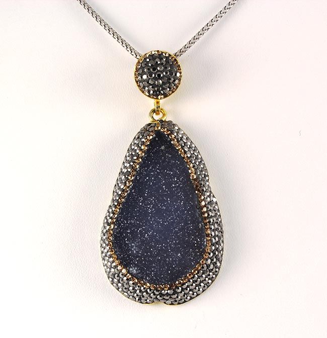 Geode Druzy Natural Stone Pendant Victorian Design **|**|** 22.93g Geode Druzy Bluish Purple Drop Natural Stone Pendant in Victorian Design w/ CZ diamonds; 925 stamp gold plated ; MSRP: $200