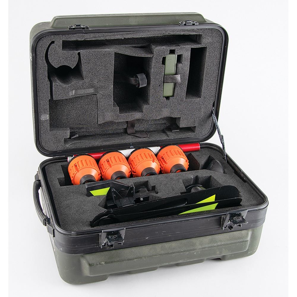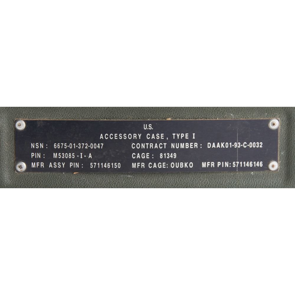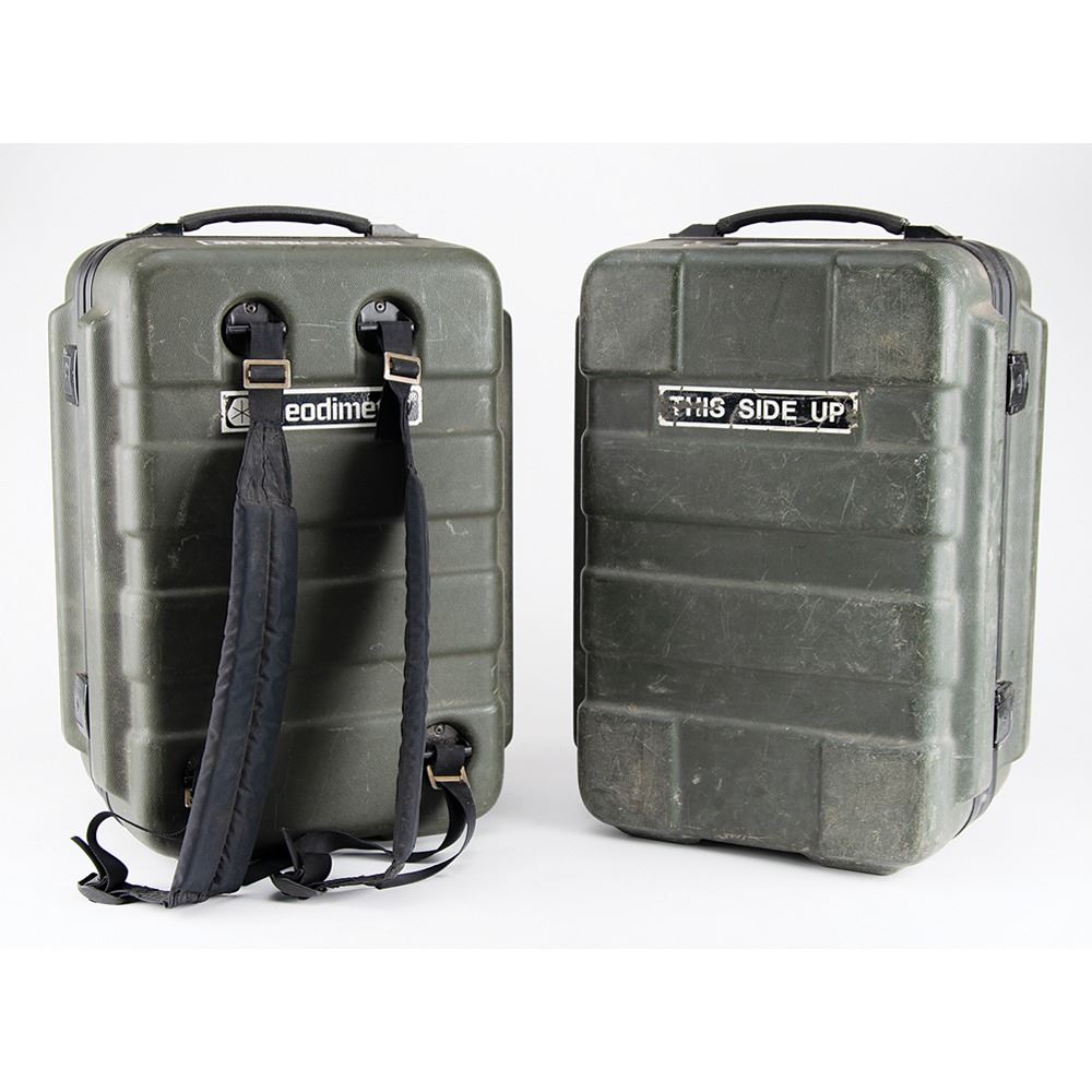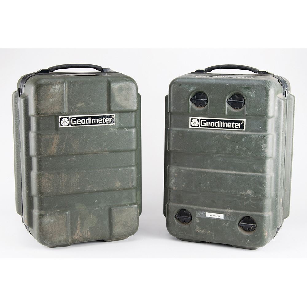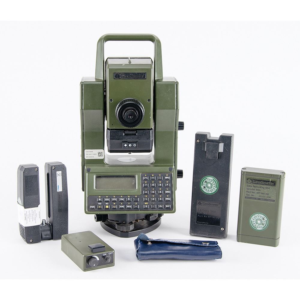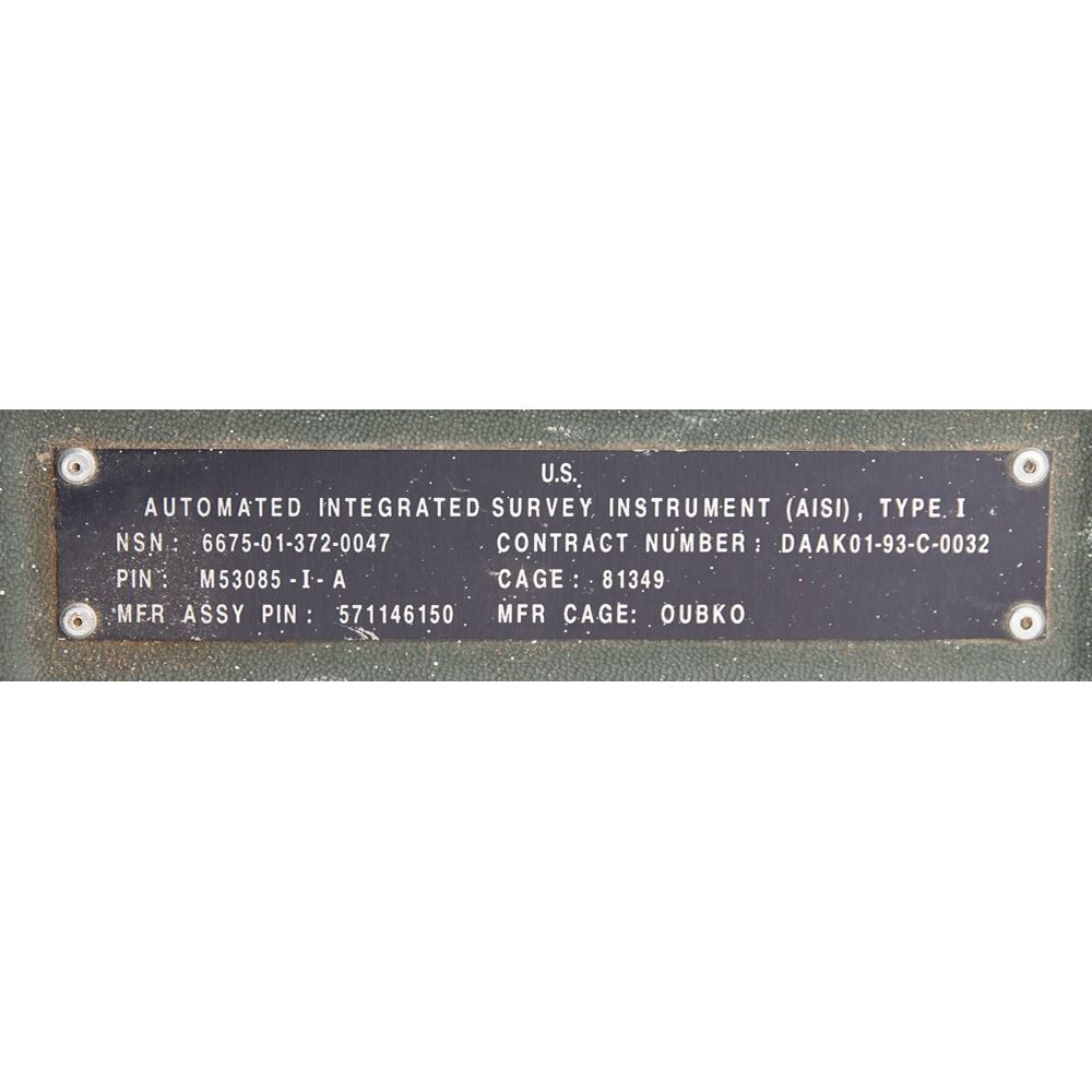 Geodimeter Automated Integrated Survey Instrument (AISI), Type 1, and accessories, housed in two 13Àù x 10Àù x 19Àù heavy-duty transport cases. The instrument is marked as "U.S. Unit, Instrument, MFR PIN: 571146002, MFR Cage: Oubko, Contr: DAAK01-93-C-0032, Serial No: 44420120." In overall very good to fine condition.