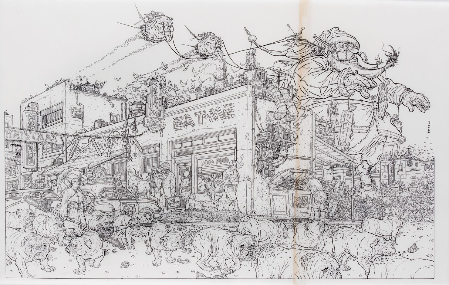 130. Geoff Darrow original Christmas themed-artwork from Hellboy Christmas Special #1 featuring "Shaolin Cowboy". (Dark Horse, 1997) Accomplished in pencil and ink on 19.5 x 30.5 in. artist's vellum, consisting of two leaves joined with tape to verso. From Hard Boiled to Shaolin Cowboy, Geof Darrow's art is immediately recognizable, with layer upon layer of hyper-intricate detail making for deeply expressive and appealing work. This imposing piece appeared in Hellboy Christmas Special #1 as a double page spread. Shaolin Cowboy strolls in the foreground, weilding chainsaws. Some yellowing along the seam. In very good condition. $600 - $800