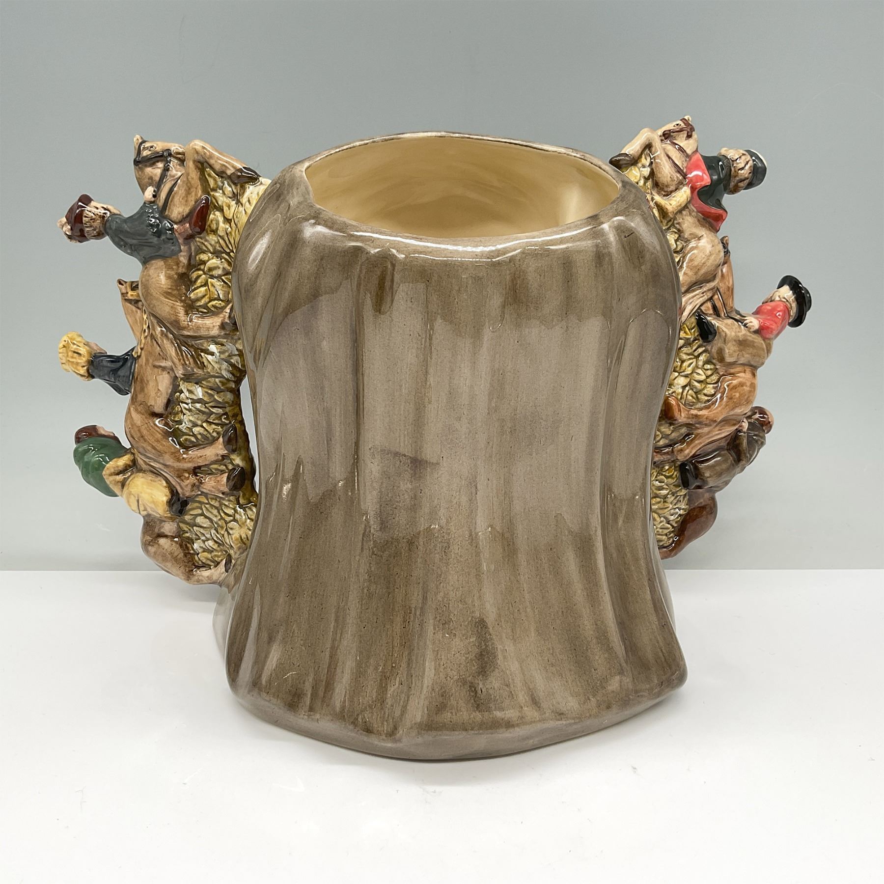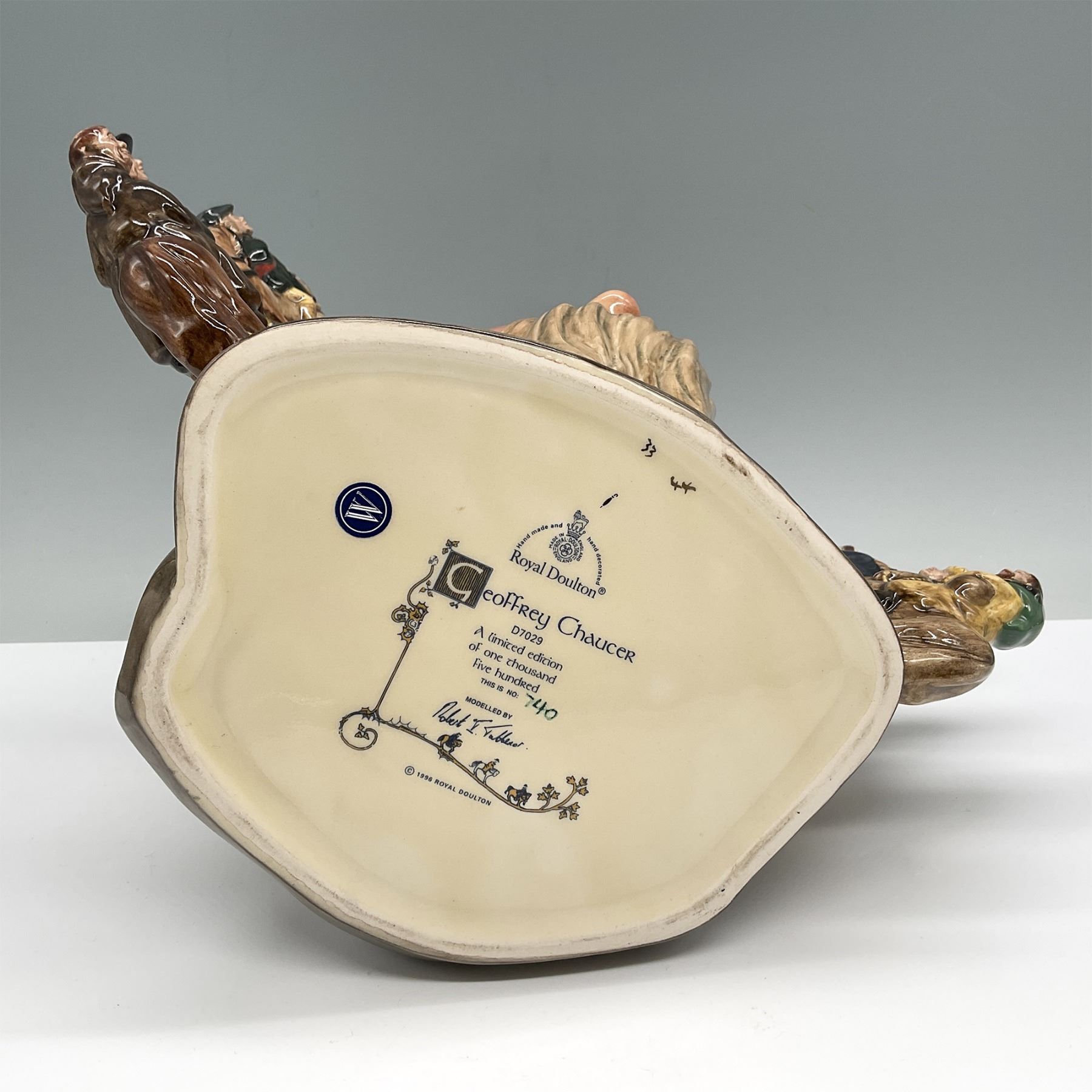 This Royal Doulton Geoffrey Chaucer character jug (D7029). Modeled by Robert J. Fellner, this jug is a tribute to Geoffrey Chaucer, the famed English author and poet. The jug features a detailed sculptural design with Chaucer's face surrounded by depictions of medieval riders on horseback, embodying a key scene from his work, "The Canterbury Tales." Made from high-quality ceramic, the jug stands 7.5"H and is decorated with vibrant hand-painted accents. The backstamp includes the Royal Doulton logo, edition details, and the signature of the modeller. This piece is a great addition to any collection of Royal Doulton character jugs.