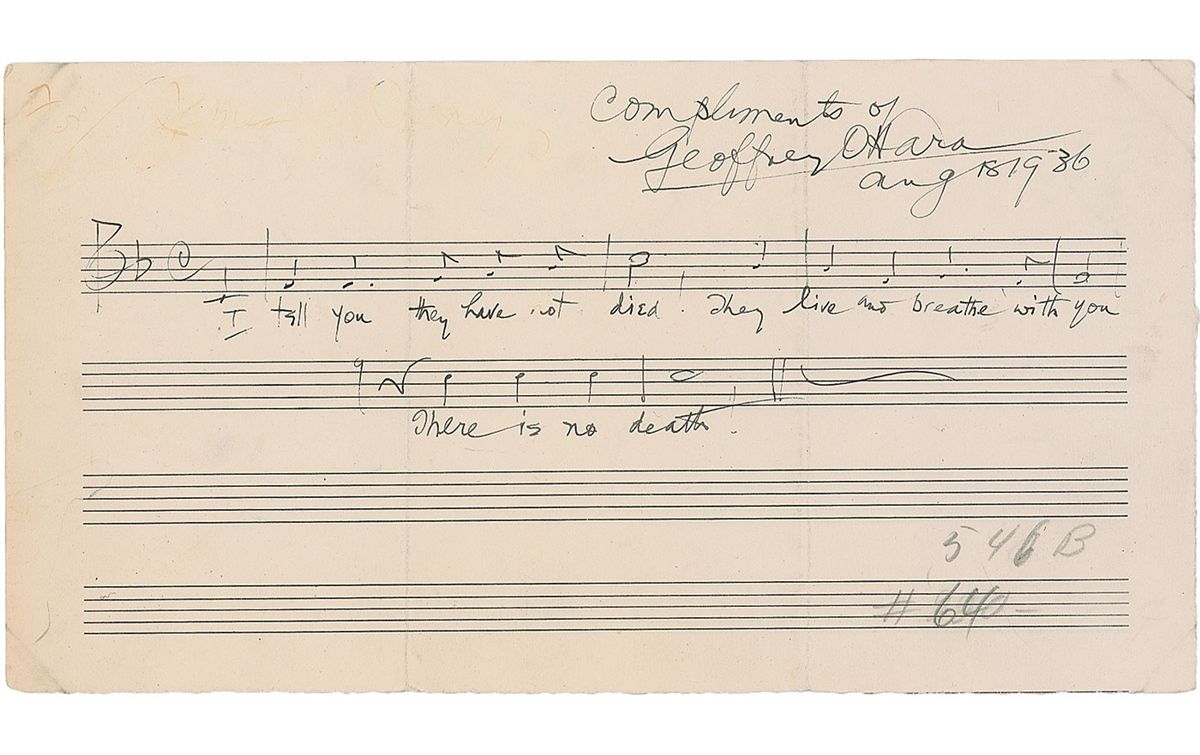 Canadian-American composer, singer, and music professor (1882–1967) who wrote over 500 popular and patriotic songs and hymns. AMQS on an off-white 9.5 x 5 musically-lined sheet, signed at the top, “Compliments of Geoffrey O'Hara, Aug 18, 1936.” O’Hara pens seven bars of music and lyrics to his composition ‘There Is No Death.’ Two vertical folds (one vertical fold passing through a single letter of the signature) and light soiling, otherwise fine condition.