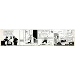 Geoge McManus - Original Comic Strip Art for Bringing Up Father dated 03-28-46 (King Features, 1946). George McManus created the ultimate hen-pecked husband, Jiggs, and chronicled his trials and tribulations for over 30 years. The first panel features a good example of the characters in silhouette, a striking and effective technique that McManus employed only occasionally. The art has minor editorial markings and light unerased pencils. Overall size is approximately 5"x 22". Image size is approximately 4" x 17". Important notice: We expect to be auctioning lots at the rate of 200-250 per hour. Sometimes eBay Premier live bid software cannot keep up with that pace, so we strongly recommend that you place a realistic proxy bid now as insurance to avoid disappointment. Also please note that all Heritage/CAA lots purchased through eBay Premier carry a 20% Buyer's Premium. Please make sure you read the Terms and Conditions.