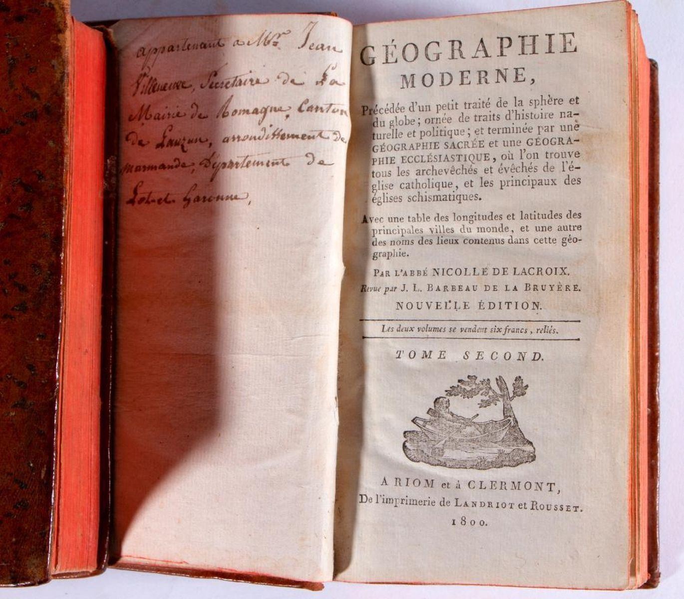 Title: Geographie Moderne Author: Par L'Abbe Nicolle de Lacroix Published: A Riom et a Clermont, 1800 Description: Hardcover. Leather bound. Two volumes. French edition. Condition: Good condition. Some worm holes.