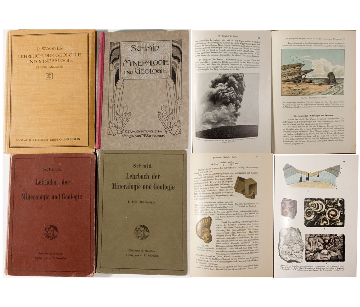 Lot of 4. 1) LEHRBUCH DER GEOLOGIE UND MINERALOGIE, translates as Textbook of GEOLOGY AND MINERALOGY. Written by Prof. Paul Wanger Printed in 1913, Berlin and Leipzig. 2) MINERALOGIE UND GEOLOGIE, translates as MINERALOGY AND GEOLOGY. By Prof. Bastian Schmid. 1915. 3) & 4) are 1904 and 1905 copies of LEITFADEN DER MINERALOGIE UND GEOLOGIE, translates as GUIDE TO THE GEOLOGY AND MINERALOGY. Both by Prof. Bastian Schmid. - Ken & Rosemary Roberts Collection -59447