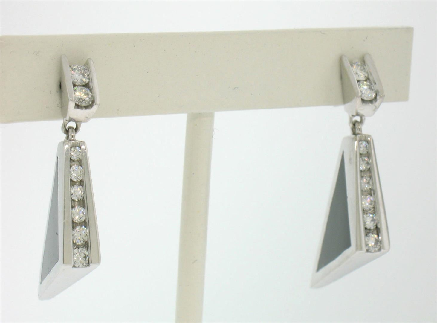 Geometric 18K White Gold Graduated Diamond Black Onyx Inlay Dangle Earrings. Please see photos and description for all available information. An estate solid 18k white gold geometric dangle earrings, faeturing inlaid black onyx and 16 round brilliant cut natural diamonds (F- VS1 ; 0.70ctw). The earrings measure approximately 32.64x4.48mm and weigh a total of 10.20 grams.