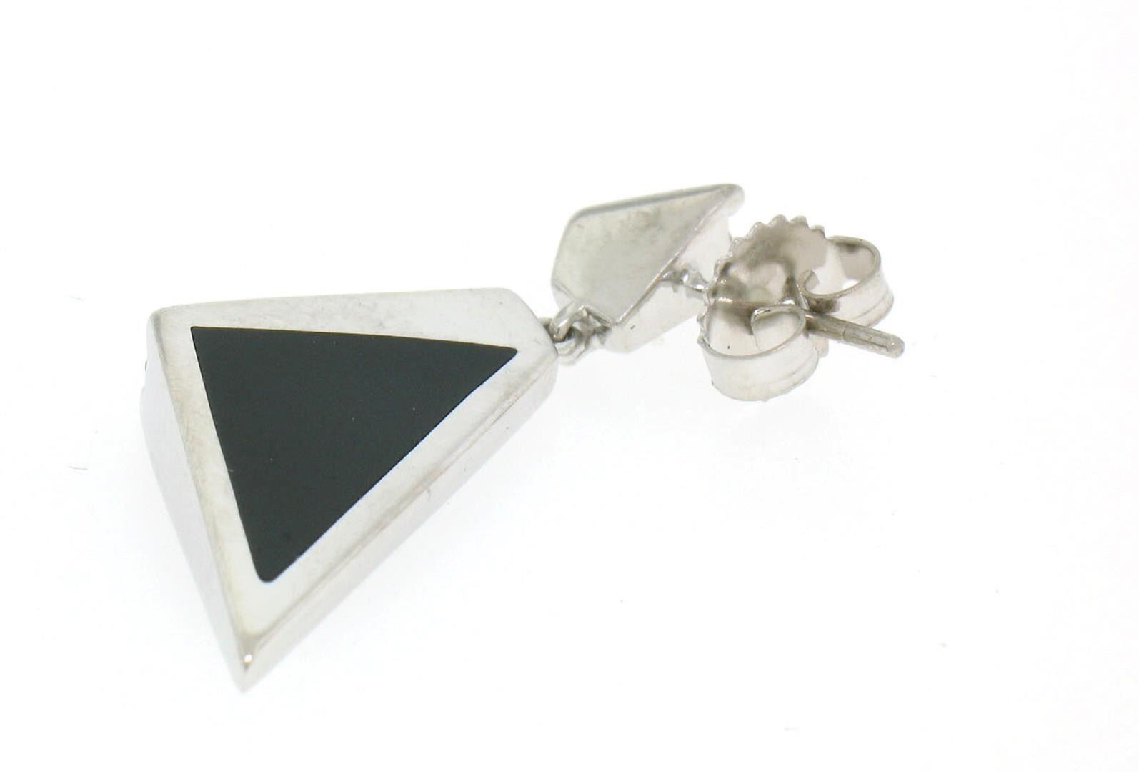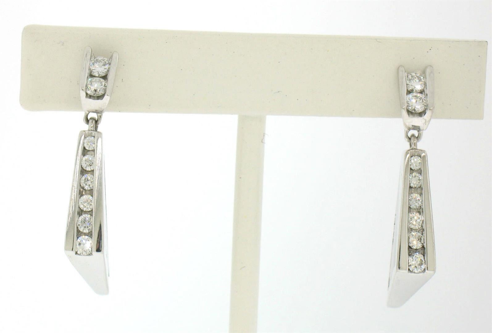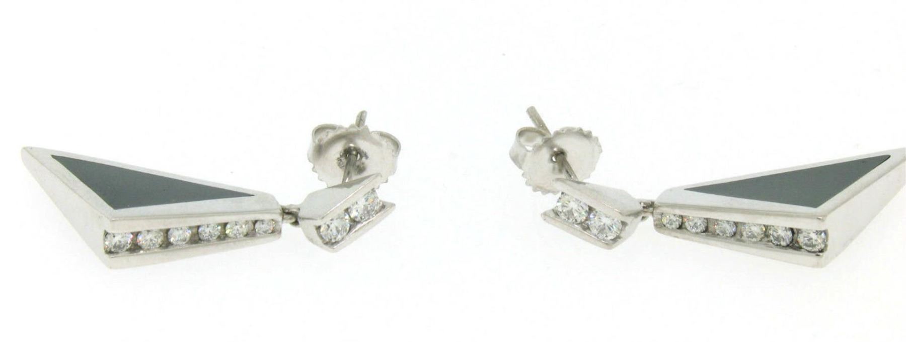 Geometric 18K White Gold Graduated Diamond Black Onyx Inlay Dangle Earrings. Please see photos and description for all available information. An estate solid 18k white gold geometric dangle earrings, faeturing inlaid black onyx and 16 round brilliant cut natural diamonds (F- VS1 ; 0.70ctw). The earrings measure approximately 32.64x4.48mm and weigh a total of 10.20 grams.