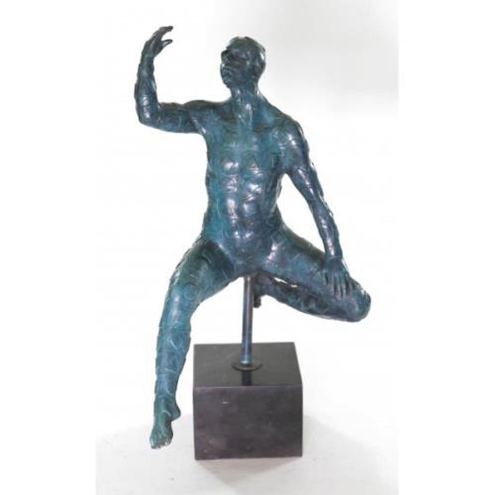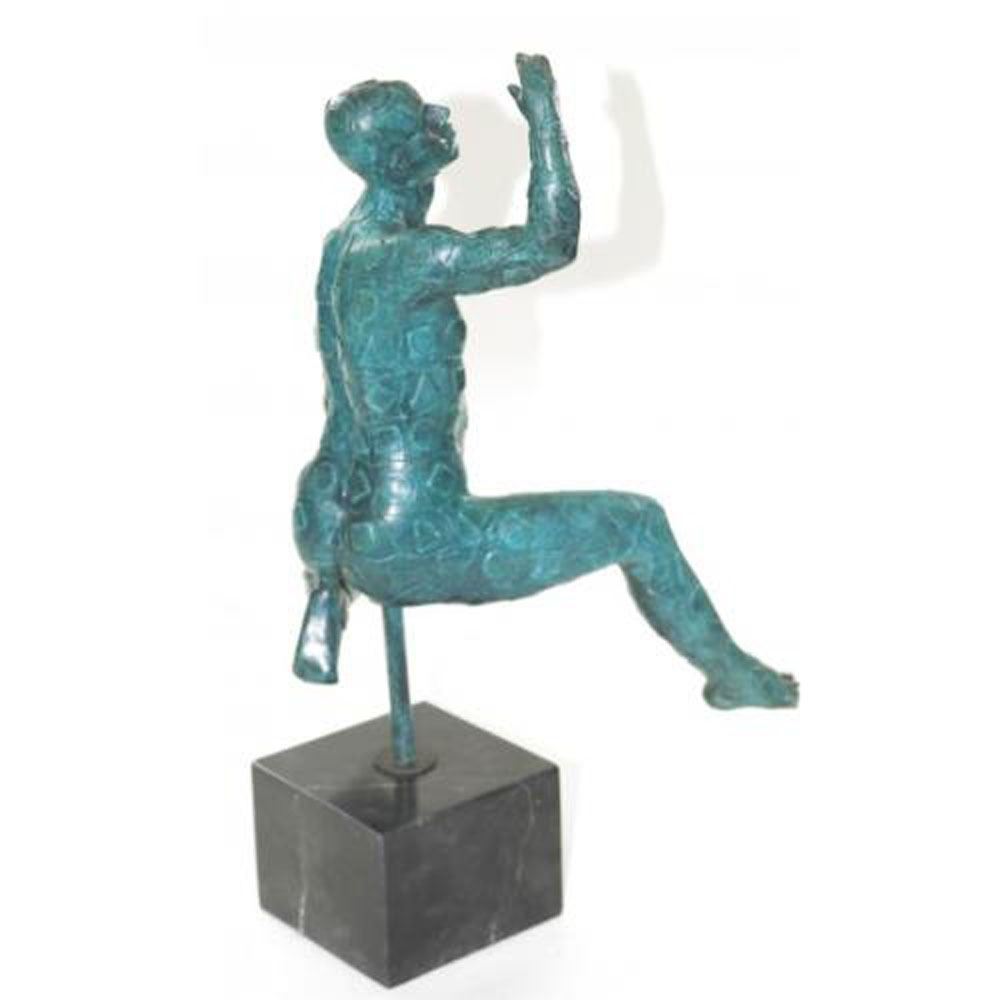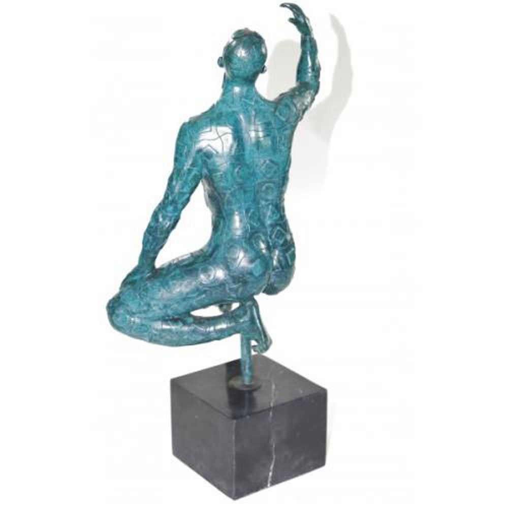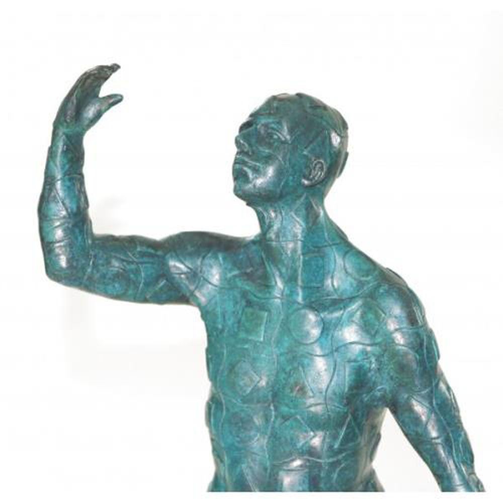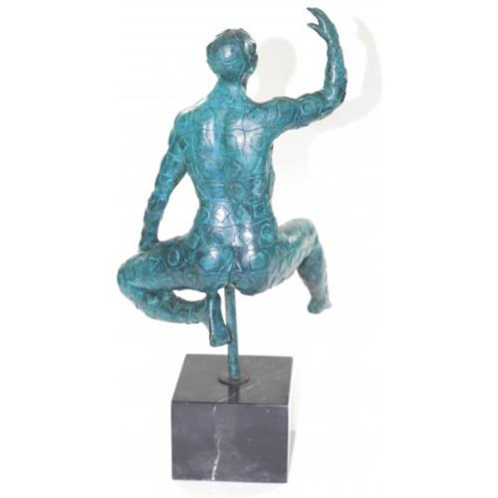 This abstract is a very odd and creative one. I guarantee you that you will have people talking about it. You can tell its a figure of a man suspended in air wearing a Geometric design outfit, but the conversation on it will be mostly about how strange art its working its way through. He has an really fit body and his legs seem to be muscular, as that was the artist intentions. He does seem posing for camera and the rest of his body is made of different little shapes to imagine what your body actually looks like under skin. The sculpture was cast using the ancient old Lost Wax Method stained in green patina and is mounted atop a marble base. Bronze Dimensions with Marble Base: Height 19 X Width 15 Inches. Weight: 20 LBS.