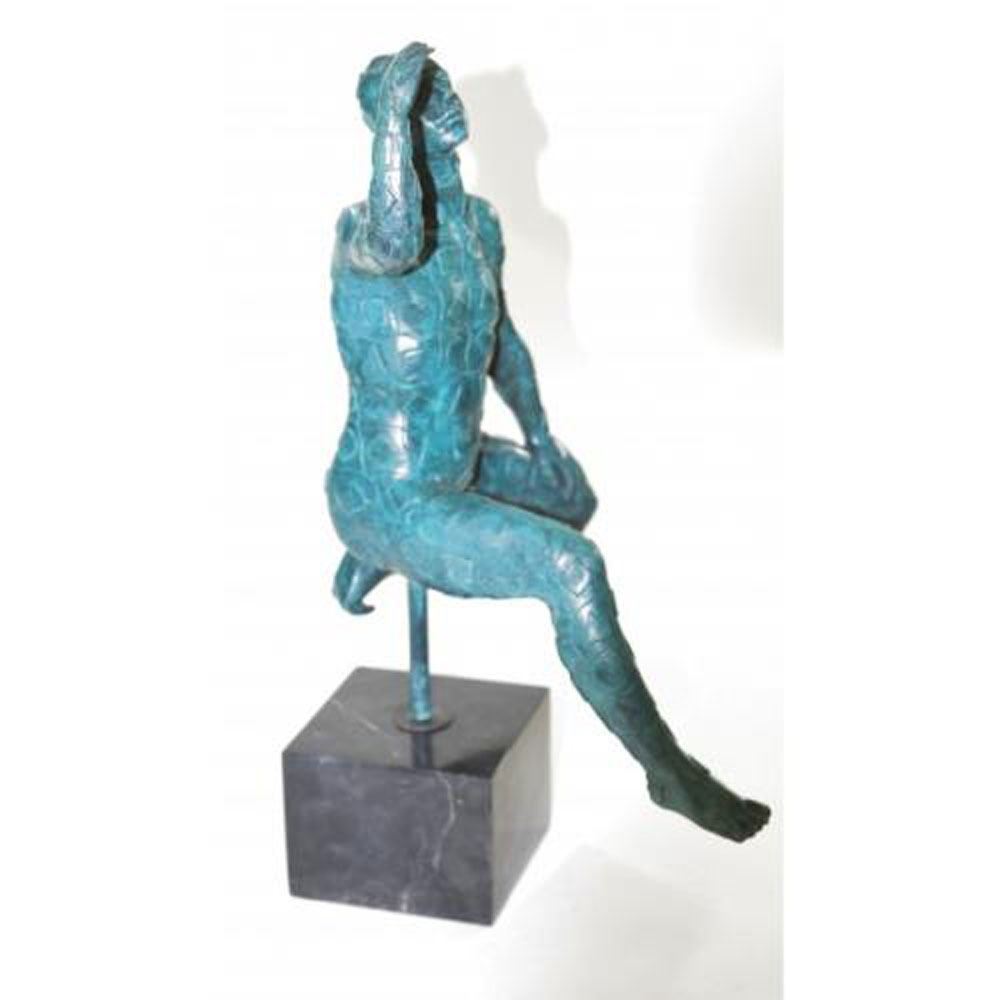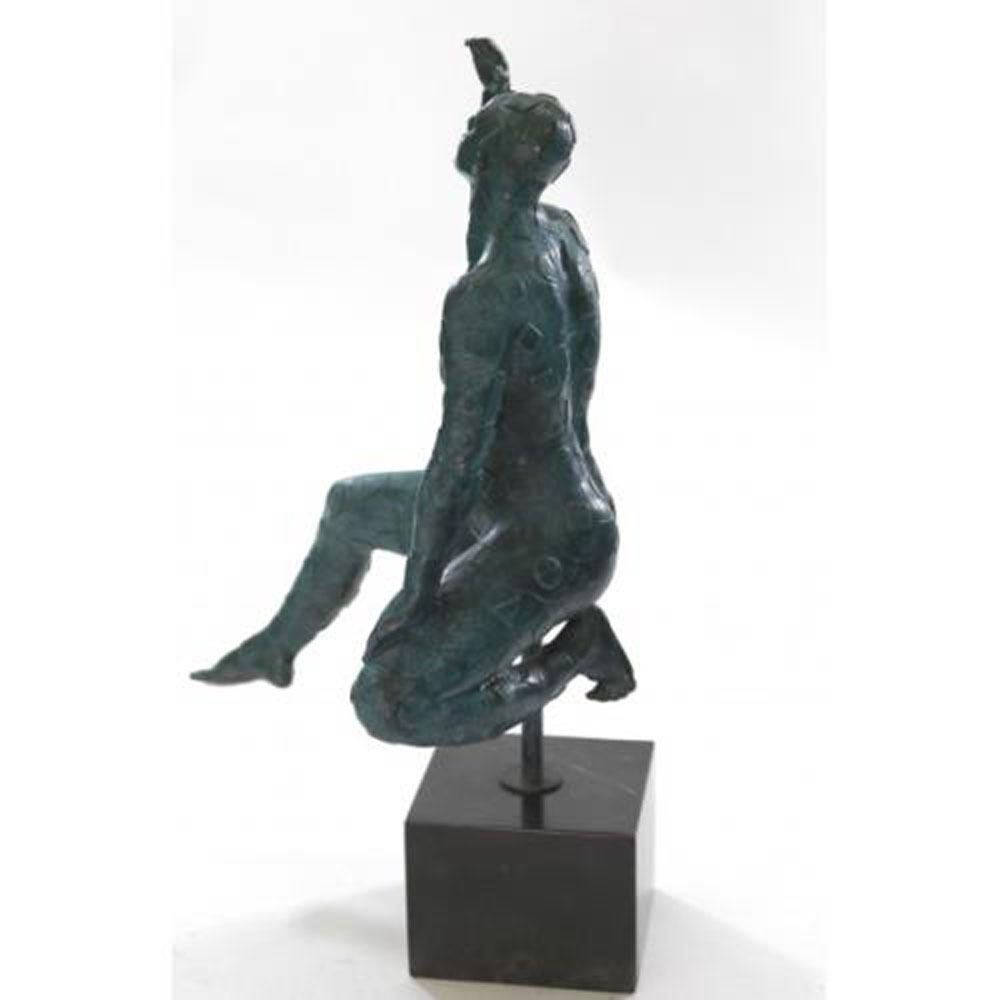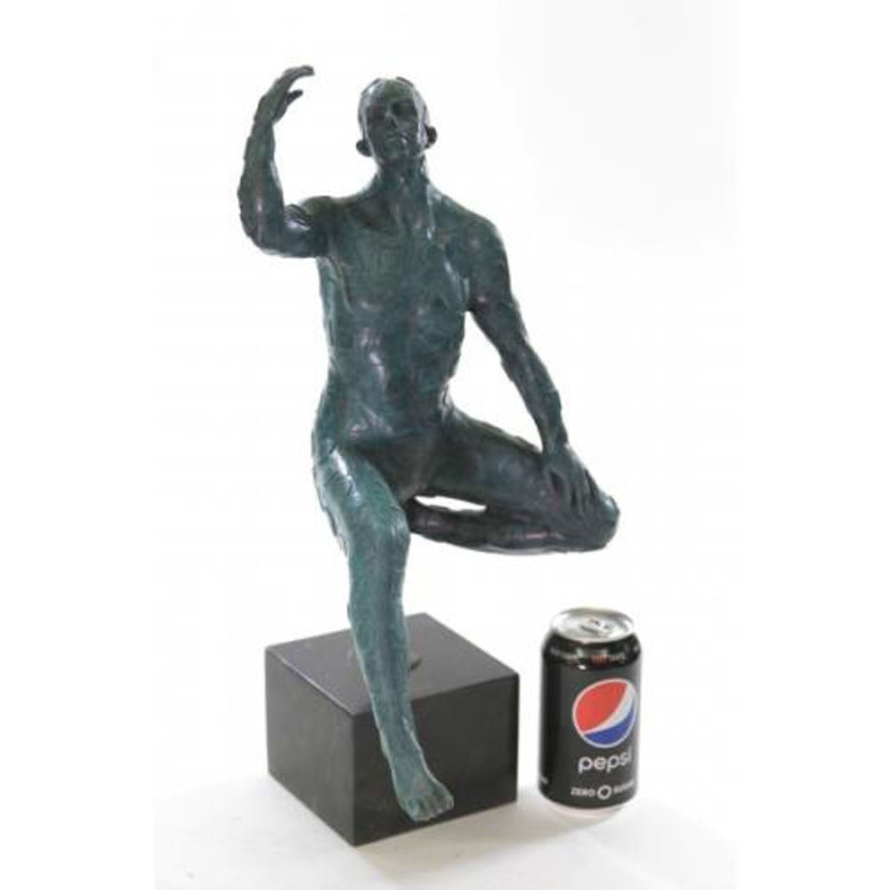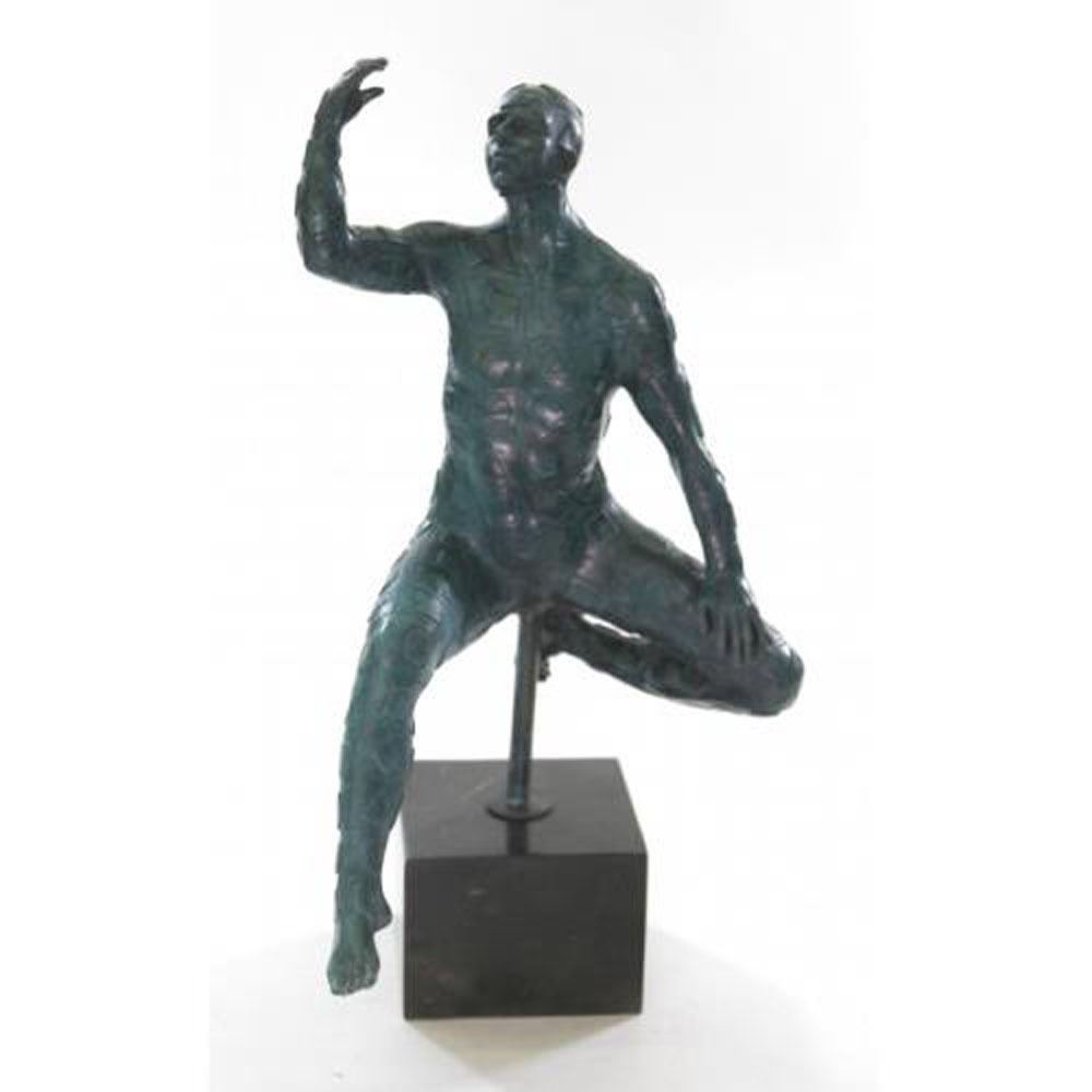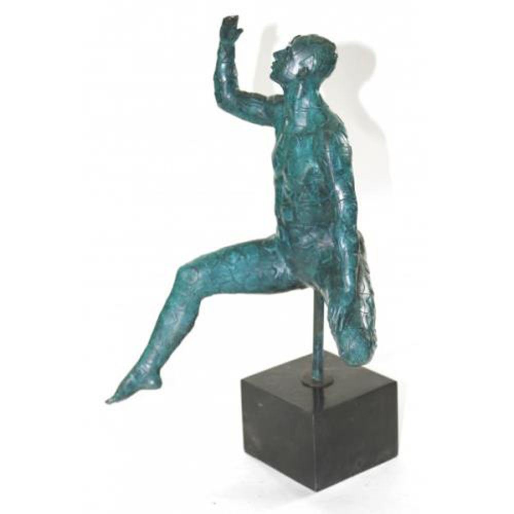 This abstract is a very odd and creative one. I guarantee you that you will have people talking about it. You can tell its a figure of a man suspended in air wearing a Geometric design outfit, but the conversation on it will be mostly about how strange art its working its way through. He has an really fit body and his legs seem to be muscular, as that was the artist intentions. He does seem posing for camera and the rest of his body is made of different little shapes to imagine what your body actually looks like under skin. The sculpture was cast using the ancient old Lost Wax Method stained in green patina and is mounted atop a marble base. Bronze Dimensions with Marble Base: Height 19 X Width 15 Inches. Weight: 20 LBS.