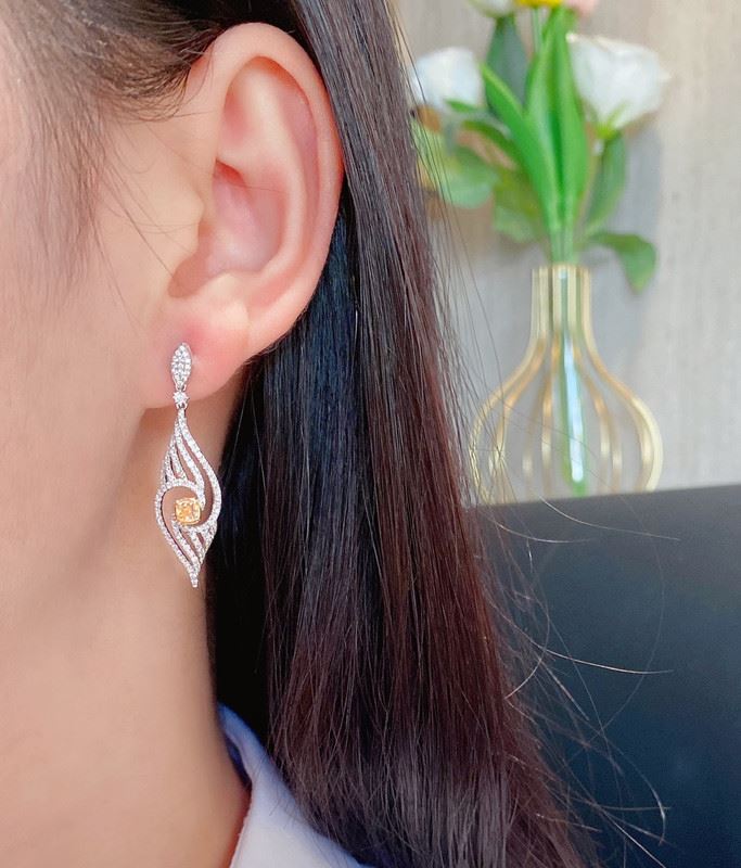 Openwork spiral silhouettes trace an elongated feather motif, with pavé white diamonds streaming along the curves. At each center, a cushion-square fancy yellow diamond anchors the design in vivid contrast. A marquise top and articulated round-diamond link add graceful movement—sleek, luminous, and ready to elevate both everyday and evening looks. Main diamond: 0.40ct, side diamonds: 0.891ct. Note: Comes with an AGL certificate and a domestic jewelry identification certificate.