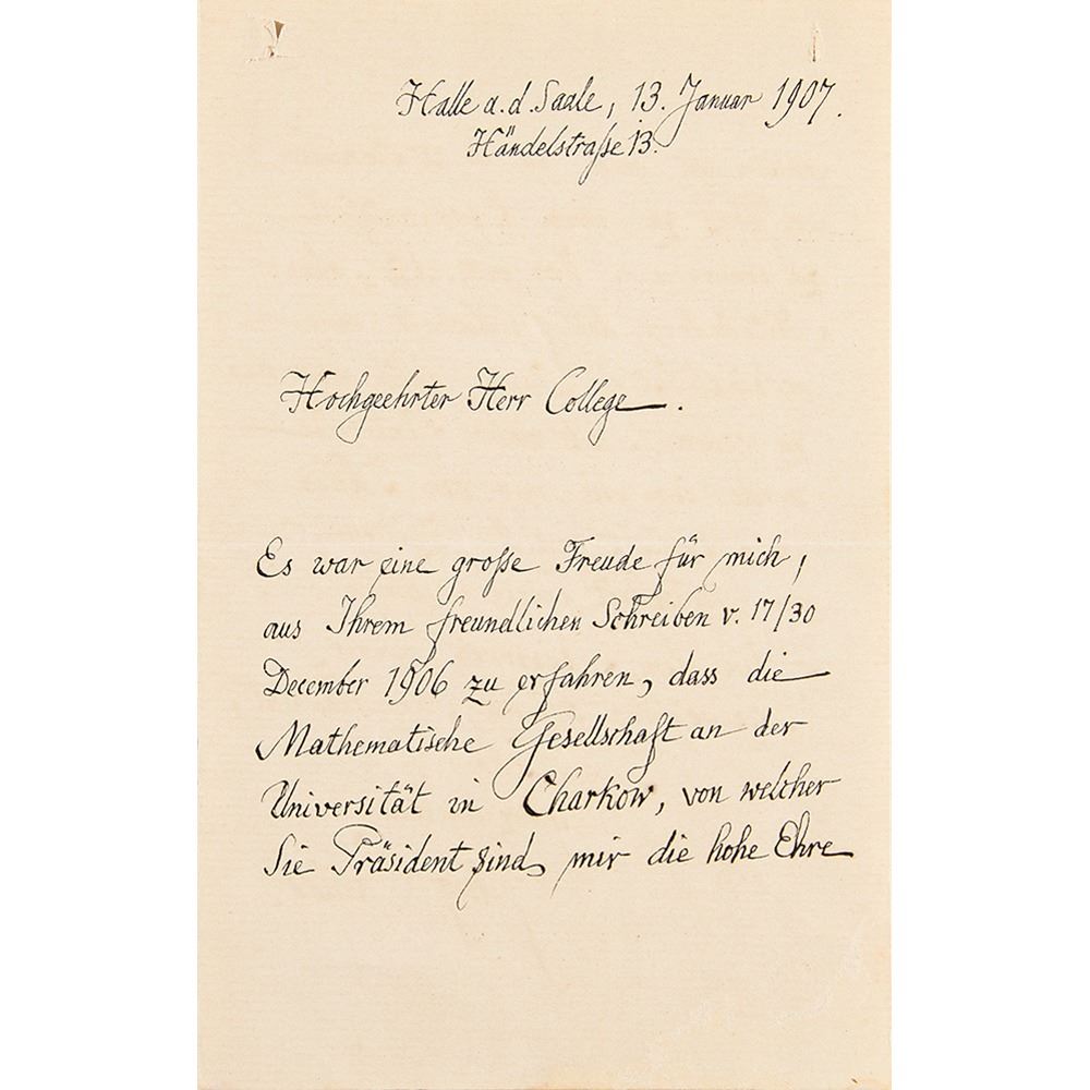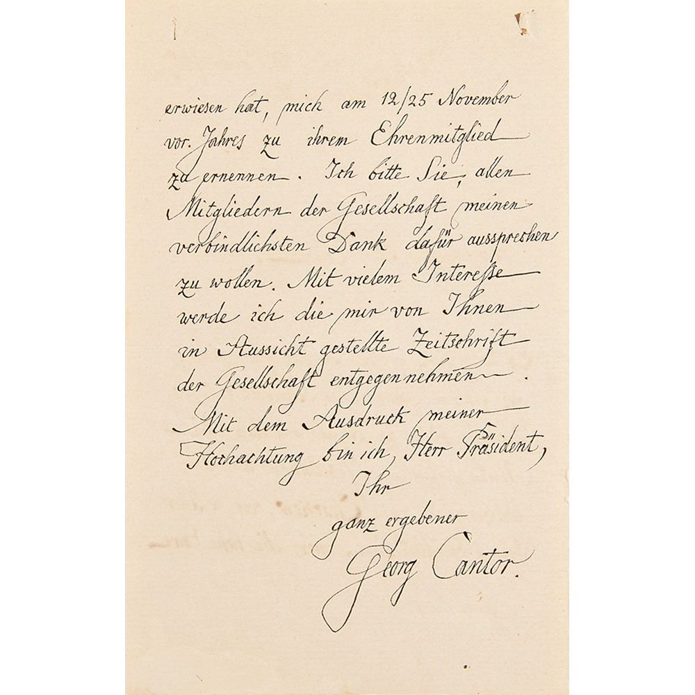 German mathematician (1845-1918) who created set theory, which has become a fundamental theory in mathematics. Cantor established the importance of one-to-one correspondence between the members of two sets, defined infinite and well-ordered sets, and proved that the real numbers are more numerous than the natural numbers. ALS in German, one page both sides, 4.5 x 7, January 13, 1907. Handwritten letter to a colleague, in part (translated): "It was a great pleasure for me to read your kind letter from 17/30 December 1906 to learn that the Mathematical Society at the University of Kharkov, of which you are President, did me the great honor of welcoming me on November 12/25 last year to appoint their honorary member. I would ask you to express my sincere thanks to all members of the society. With great interest I will accept the Society's magazine that you have promised me." In fine condition, with two tiny file holes at the top edge.
