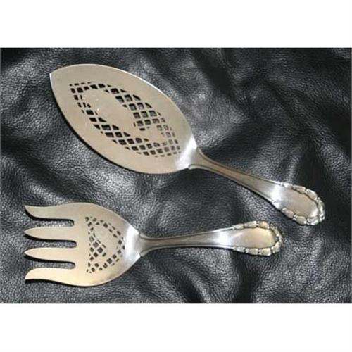 </font></strong>These early Georg Jensen fish servers have wonderful pierced work and ornately detailed fish. Impressed company marks circa 1929 . Fish Slice is 9.875 inches long and fish serving fork is 8.25 inches long. </font>