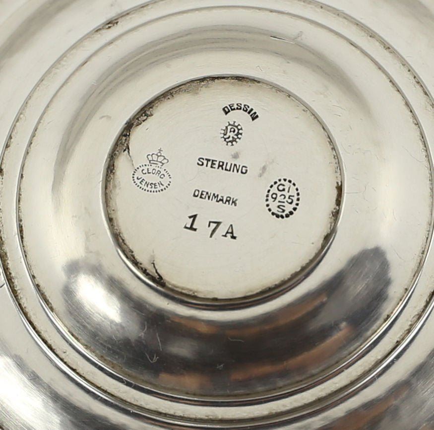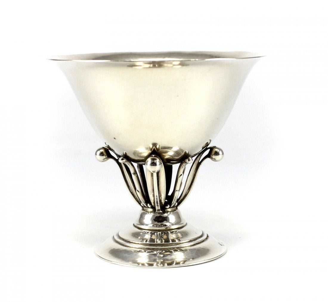 A Georg Jensen sterling silver compote bowl designed by Johan Rhode in 1912. Hand hammered design. Marked sterling, numbered 17A. 6 grams. 4.5 inch diameter, 4 inches tall
