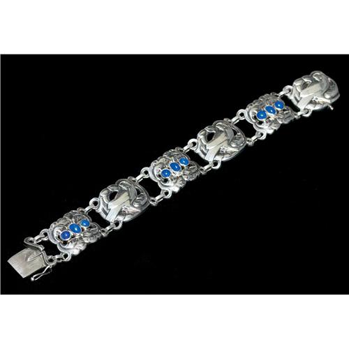 Georg Jensen bracelet, bird and leaf designs in sterling silver with inset lapis stones, signed,2.5in.dia.