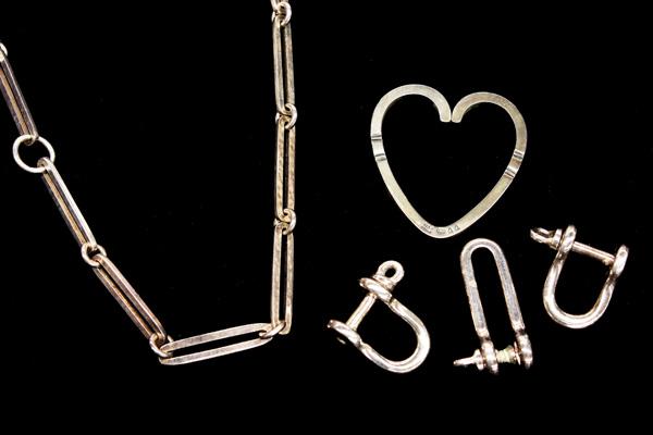 Colleciton of Denmark silver items, including; a Georg Jensen ''Heart'' stamped and marked 925S 44, a Georg Jensen 925 silver 195A link chain necklace and three screw in ''U'' rings stamped Denmark OLEL 925S. Total collection weight 90.3 grams