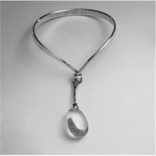 Georg Jensen sterling bracelet designed by Vivianna Torun in 1967. Though still in production until recently, this is one of the originals, denoted by the rutilated quartz as opposed to the clear quartz used to make the later pieces. The bracelet has a diameter of 2.5" inches, with the drop hanging down 2". Handmade in Copenhagen, Denmark, post-45. Alastair Crawford, LLC deals exclusively in Georg Jensen sterling silver and 18K gold.