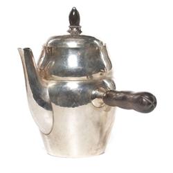 Georg Jensen teapot, hammered sterling silver with wooden handle and finial, monogram, impressed hallmarks, 6.5”h