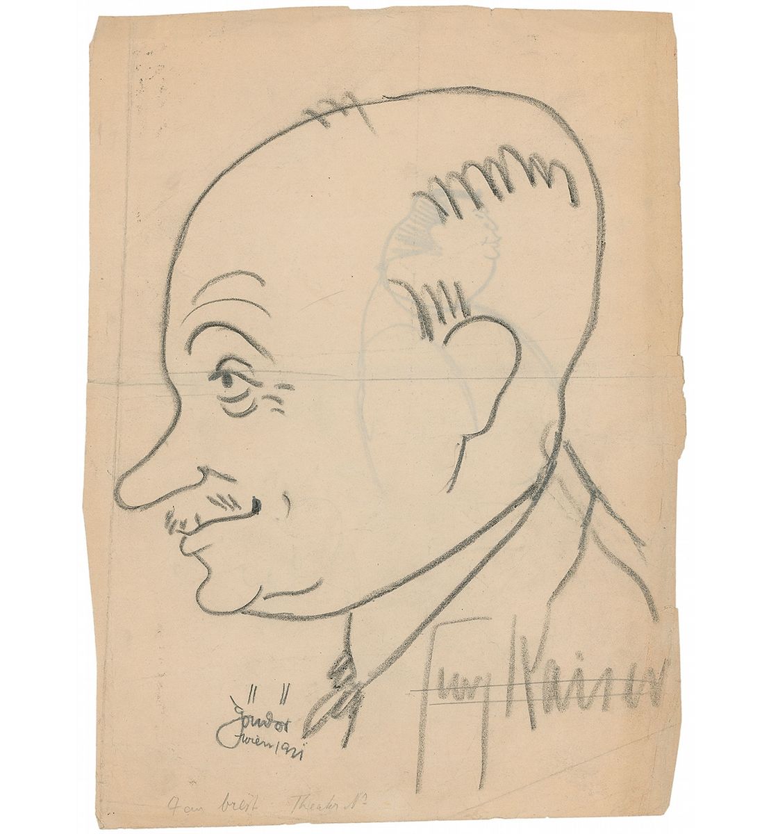 German dramatist (1878–1945) of the Expressionist movement. Pencil sketch of a caricature portrait of Kaiser by Emery Gondor on an off-white 10 x 14 sheet, signed in pencil by the artist, “Gondor, 1921,” and the subject, “George Kaiser.” In very good condition, with a heavy horizontal fold, overall creases and wrinkling, and a few edge tears.