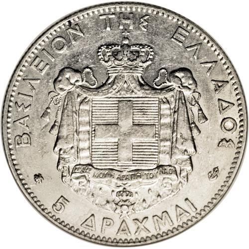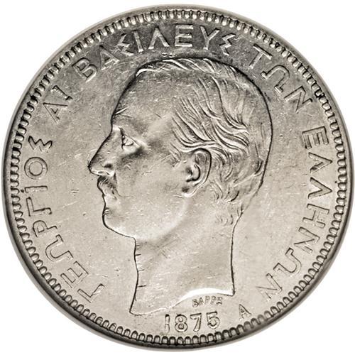 George 5 Drachmai 1875-A, KM46, AU55 NGC, sharp details