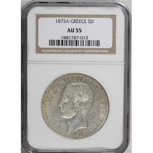 <B>George 5 Drachmai 1875-A, </B></I>KM46, AU55 NGC, sharp details with very little wear evident, abundant mint luster and typical small contact marks.