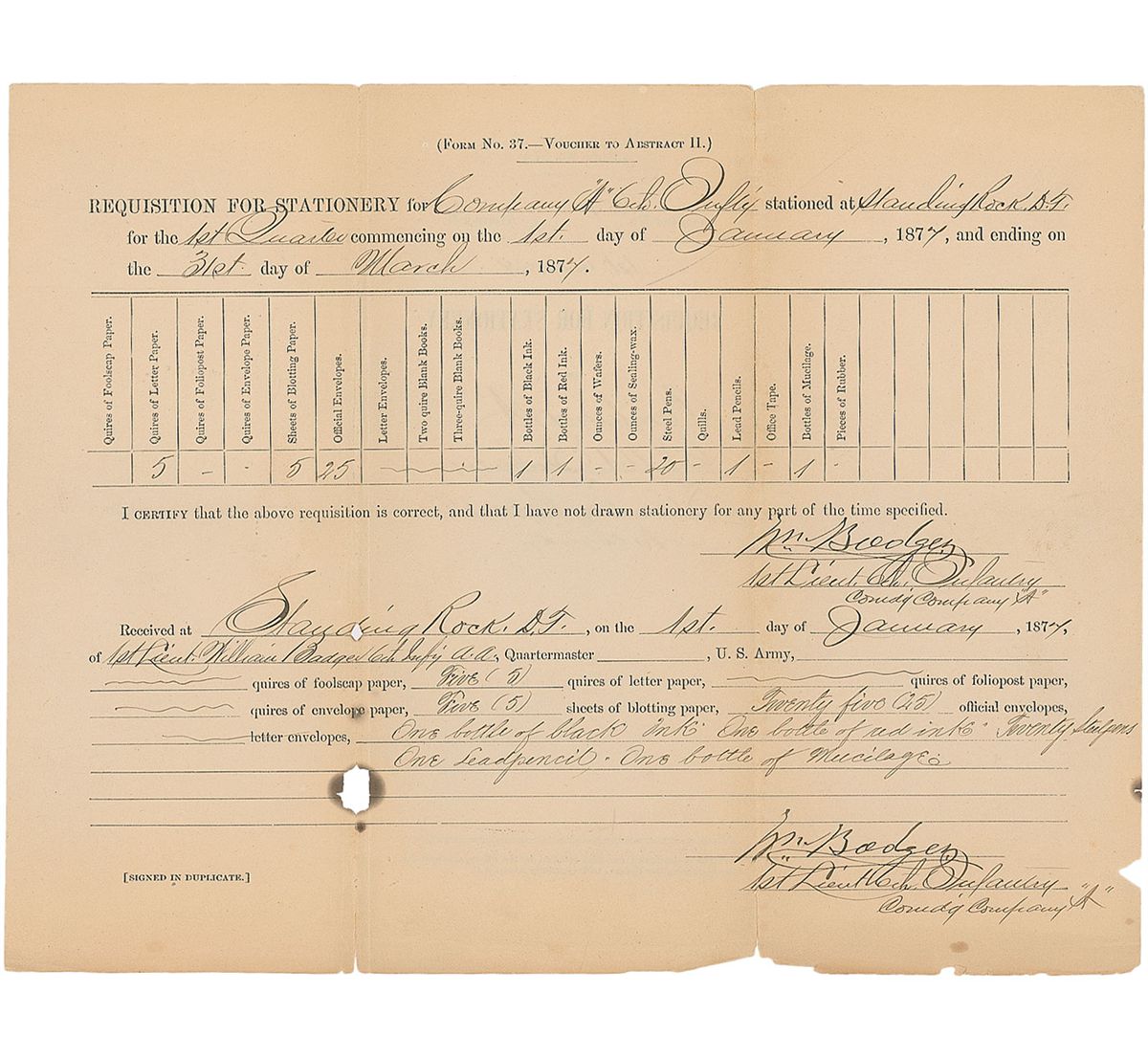 William Badger (1826–1897) served in the 6th US Infantry and was quartermaster at Fort Lincoln when Custer's 7th Cavalry was stationed there preceding the Battle of the Little Bighorn. DS signed twice, “Wm. Badger,” one page, 8.75 x 11, January 1, 1874. A requisition document ordering stationery for the first quarter of 1874, including five quires of letter paper, 25 official envelopes, bottles of black and red ink, 20 steel pens, and one lead pencil. Signed twice by Badger to certify the order and receipt of the goods at Fort Lincoln in Standing Rock, Dakota Territory. In very good condition, with small burn holes and chipping to edges.