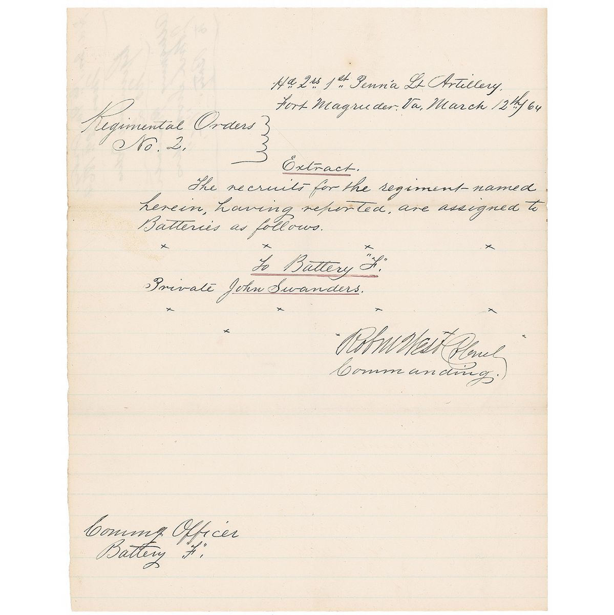 Robert West (1834–1869) was a captain in the 7th Cavalry and submitted charges against General Custer leading to his court martial. Civil War–dated manuscript DS signed “Rob. M. West, Colonel,” one page, 7.75 x 9.75, March 12, 1864. An extract from regimental orders issued at Fort Magruder, Virginia. In full: “The recruits for the regiment named herein, having reported, are assigned to Batteries as follows. To Battery ‘F’: Private John Swanders.” In fine condition.