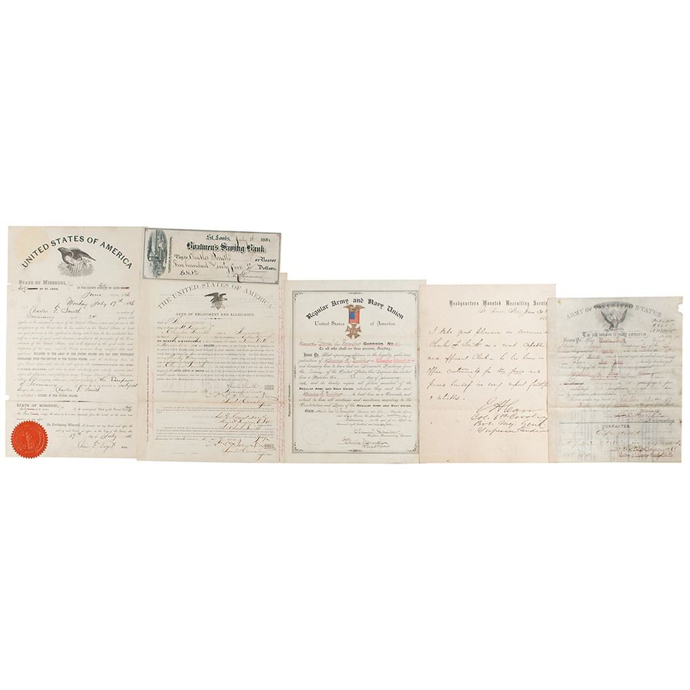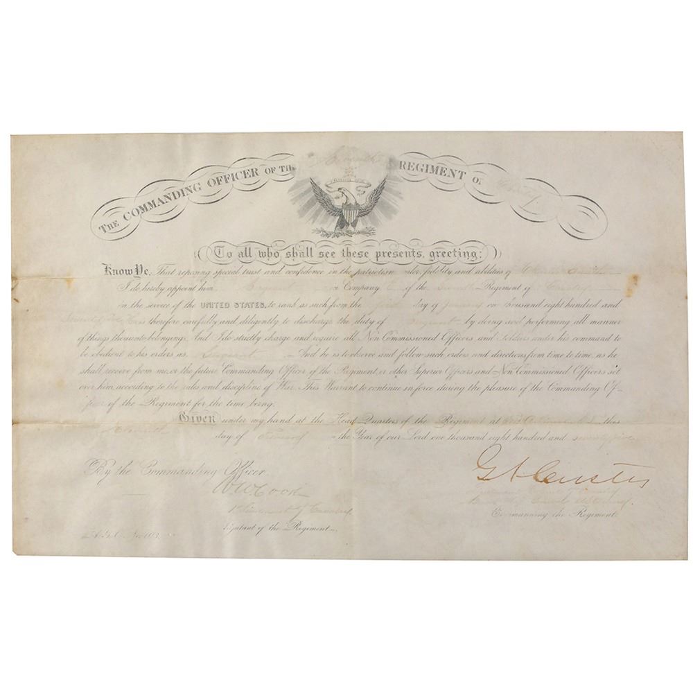 Extremely rare and highly sought-after partly-printed vellum DS, signed "G. A. Custer," one page, 15.5 x 9.75, February 11, 1875. Custer, as Lieutenant Colonel of the Cavalry, appoints "Charles Smith…a Sergeant in Company E of the Seventh Regiment of Cavalry in the service of the United States." Robustly signed at the bottom by Custer and countersigned by commanding officer W. W. Cooke. In fine condition, with a few small stains, and the handwritten portions of the body of the document light but legible. The appointee, Charles F. Smith, was born in 1848 in Germany and enlisted in the United States Army on March 3, 1871, for a term of five years; fortunately, this term expired and he was discharged just three months before the Battle of the Little Bighorn and 'Custer's Last Stand,' in which his company was annihilated. Smith then reenlisted in 1881 for another period of five years. The Custer appointment is accompanied by a small archive related to Smith's career, including the discharge from the end of his first term of service; his subsequent oath of reenlistment and allegiance; a letter of recommendation; his membership certificate in the Regular Army and Navy Union; a certificate of deposit issued by Boatmen's Saving Bank in St. Louis; and a document granting him citizenship in the United States.
