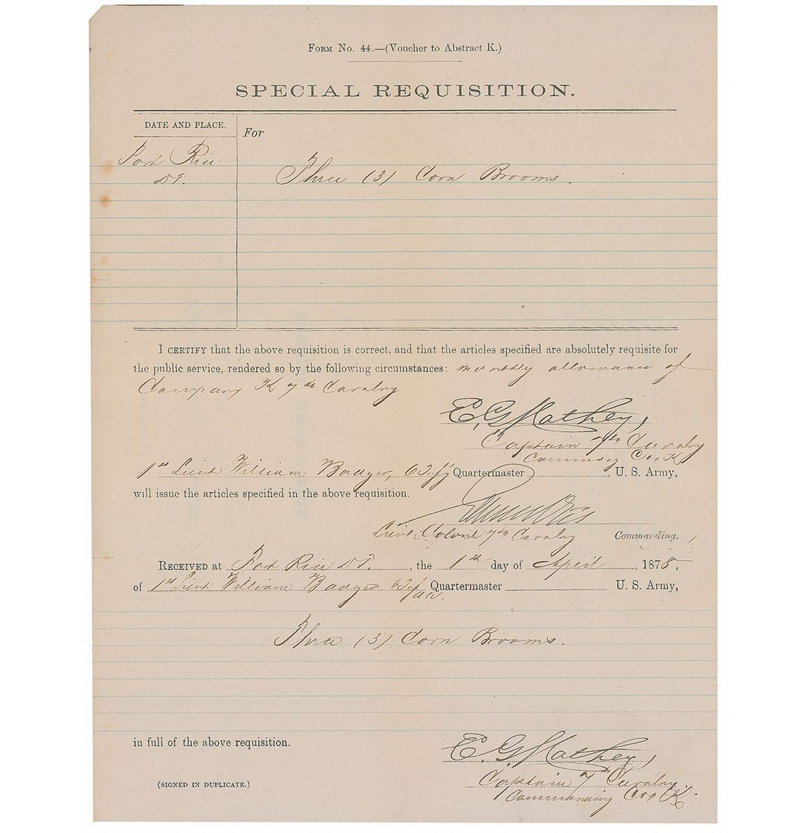 Officer in the 7th Cavalry who commanded the pack train at Little Bighorn (1837–1915). Scarce partly-printed DS, signed twice, “E. G. Mathey,” one page, 8.5 x 11, April 1, 1878. Special requisition document ordering “Three (3) Corn Brooms” to fulfill the “monthly allowance of Company K 7th Cavalry.” Signed twice at the conclusion by Mathey as a captain in the 7th Cavalry and countersigned by Elwell Otis as a lieutenant colonel in the 7th Cavalry. In fine condition, with expected document wear and unobtrusive foxing to left edge. Otis (1838–1909) also participated in the action during the Little Bighorn campaign as a member of the 22nd Infantry Regiment.