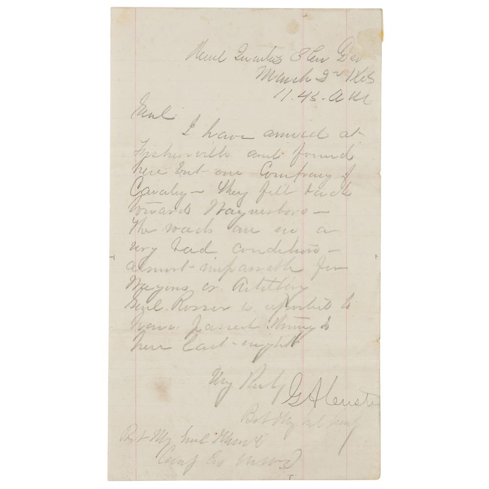 Extremely important Civil War–dated LS in pencil, signed “G. A. Custer,” one page, 4 x 7.25, 11:45 AM on March 2, 1865. Letter to Bvt. Maj. Gen. Lewis Addison Grant, reporting on troop movements and conditions. In full: "I have arrived at Fisherville and found here but—one Company of Cavalry—they fell back toward Waynesboro—The roads are in a very bad condition—almost impossible for wagons or artillery. Genl. Rosser is reported to have passed through here last night." In very good to fine condition, with several horizontal folds and a few small stains. Accompanied by an unsigned engraved portrait.
